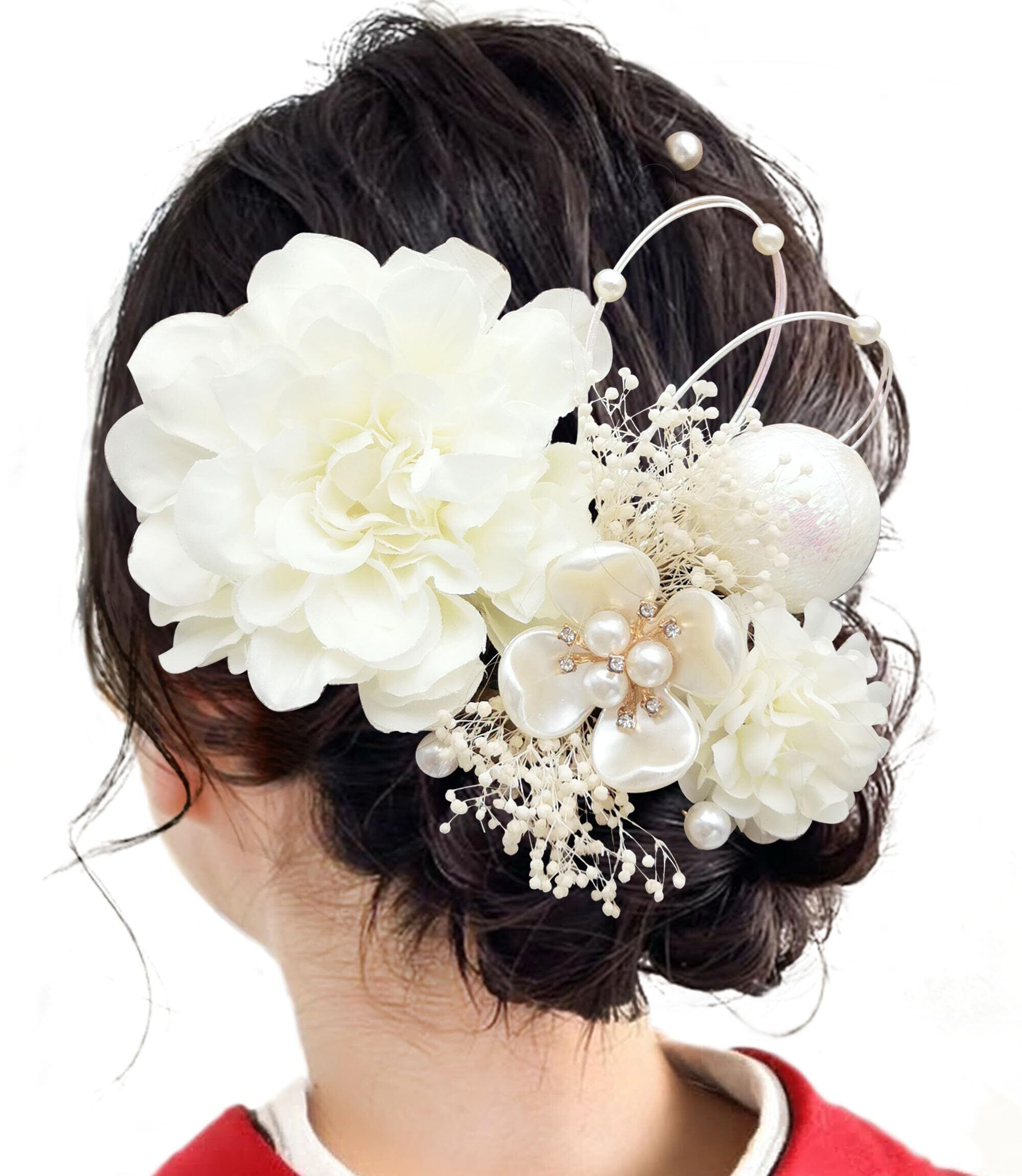 [Baramoly] 髪飾り 成人式 和装小物 卒業式 結婚式 和装 着物 袴 振袖 ダリア プリザーブドフラワー かすみ草 あじさい ヘアアクセサリー 水引 ヘッドパーツ 専用ケース付き ホワイト DA1003