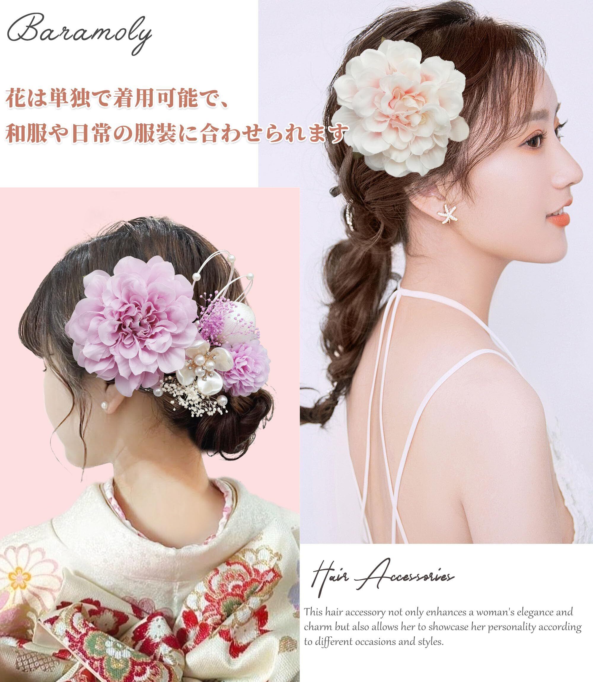 【ダリアの髪飾りセット】この12点の髪飾セットは、存在感抜群の純色大きめダリアを中心にデザインされています。さまざまな要素を組み合わせることで、華やかさと愛らしさを兼ね備えたアイテムが揃っています。ピンポンマム、かすみ草、水引、樹脂フラワー、そしてパールをあしらったこのセットは、特別な日の装いにぴったりの選択肢です。