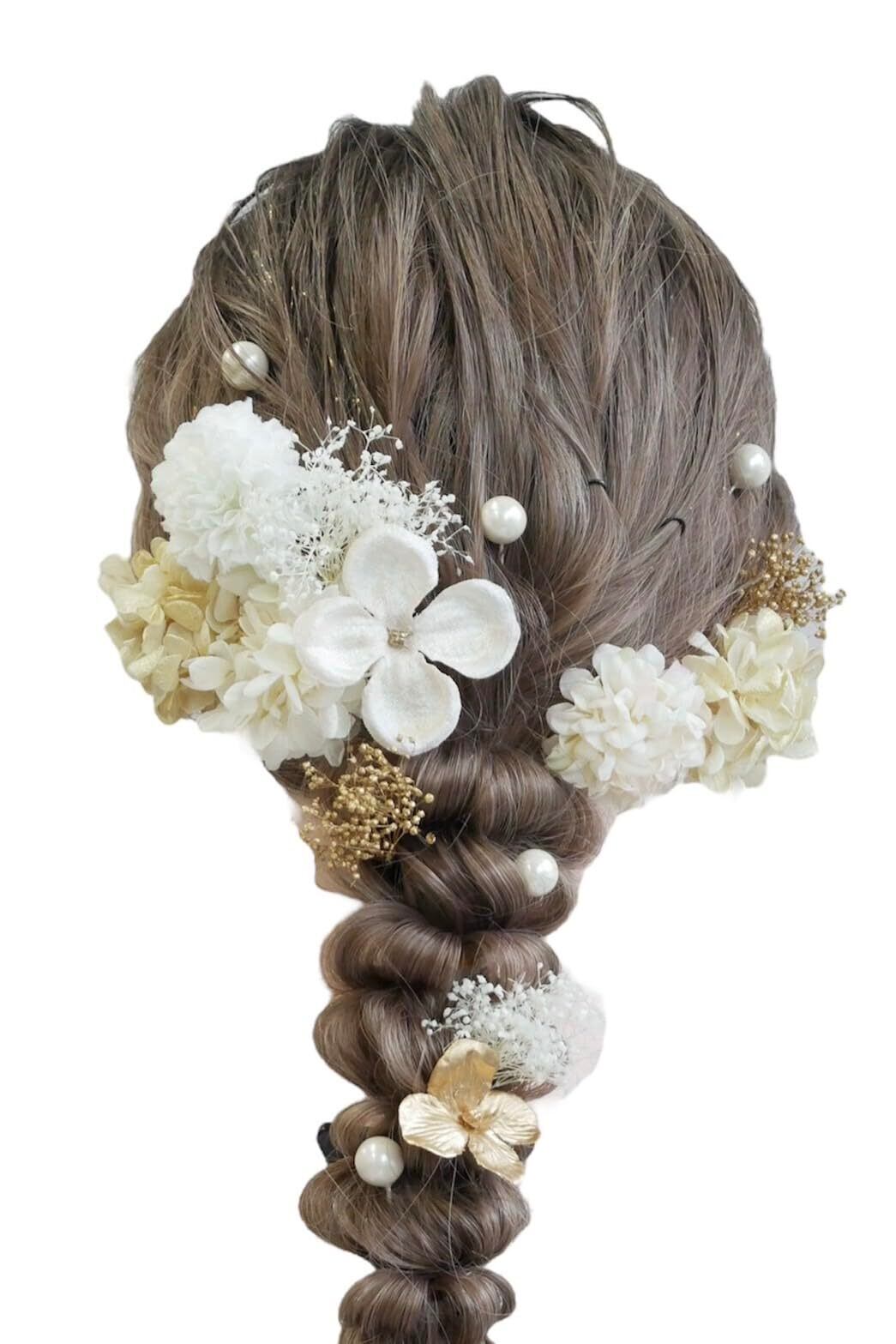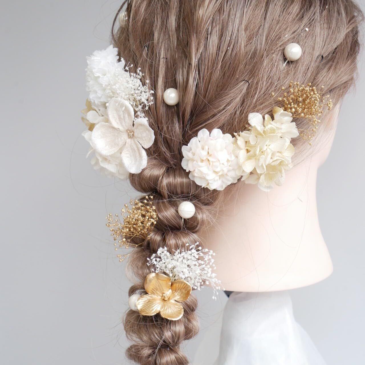 マムにドライフラワー、パールピックを組み合わせた髪飾りです。 編みおろしだけでなく、アップスタイルにもお使いいただけます。