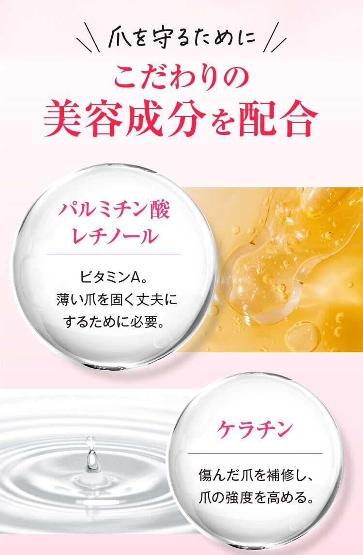 3種類の美容成分とネイル補強物質を配合してます。 パルミチン酸レチノール ケラチン ホホバ油 ナイロン66(微細ファイバー)