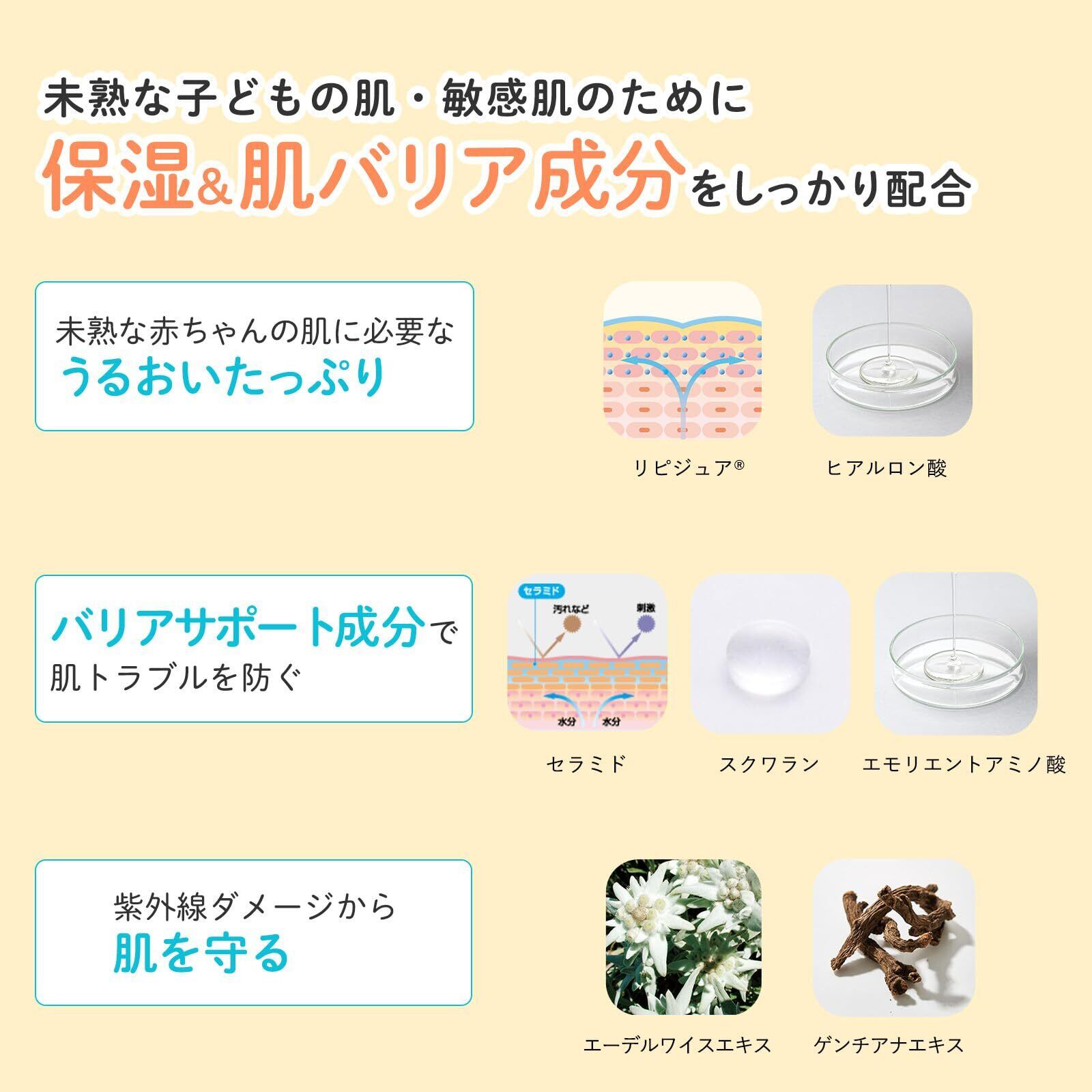 【生まれてすぐ(0カ月)の赤ちゃんから使えるやさしさ】紫外線吸収剤が直接肌に触れない「カプセルインUVシールド」処方を採用しているため、生まれてすぐ(0カ月)の赤ちゃんからUVケアとして使用することができます。