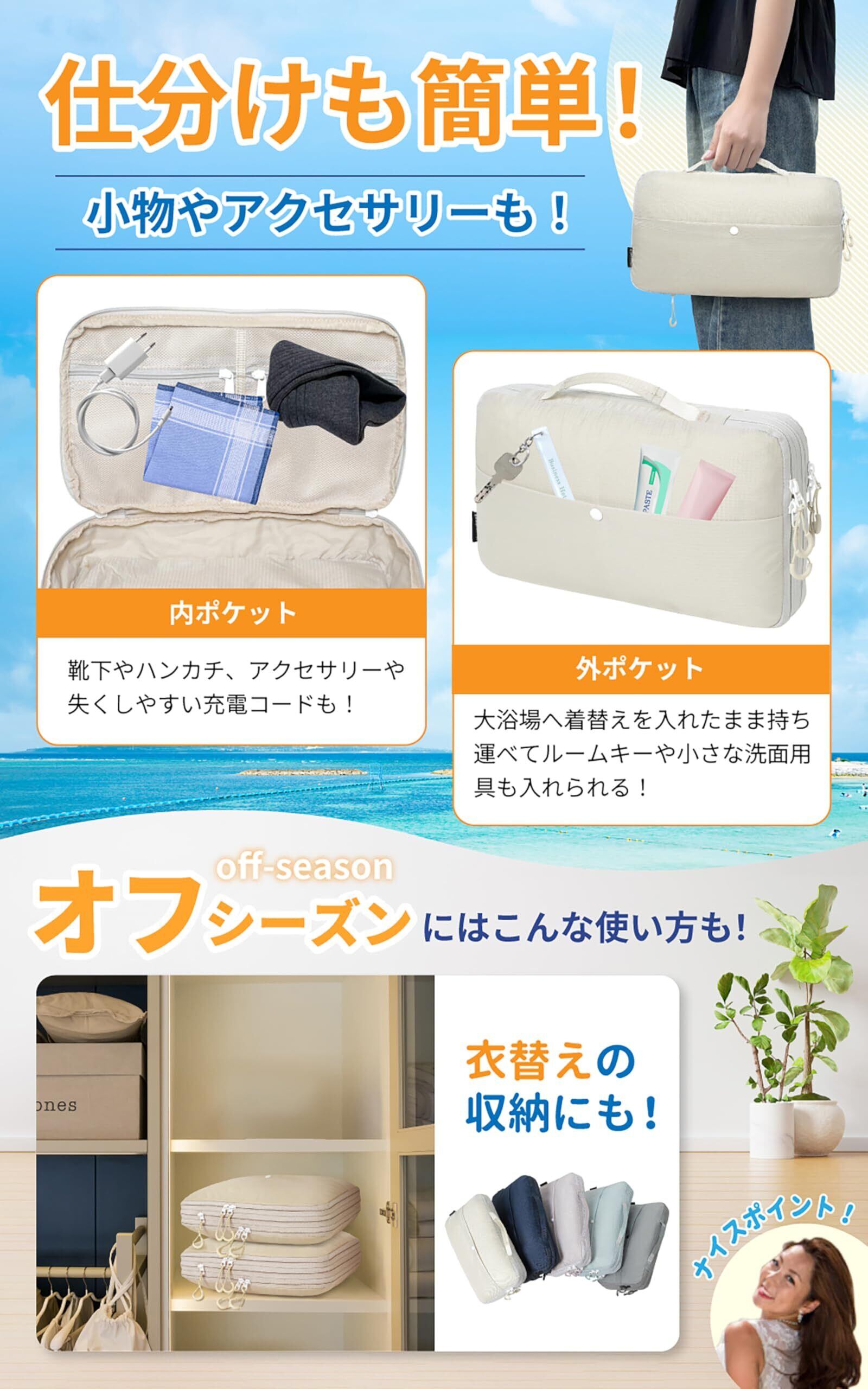 【旅行便利グッズ】PHOENIVERの圧縮ポーチはただ圧縮するだけでなく、便利性も考えての外内ポケット付き!これで小物仕分けの悩み解消!外ポケットにハンカチやスマホなどを入れて、必要な時にすぐに取り出せます!