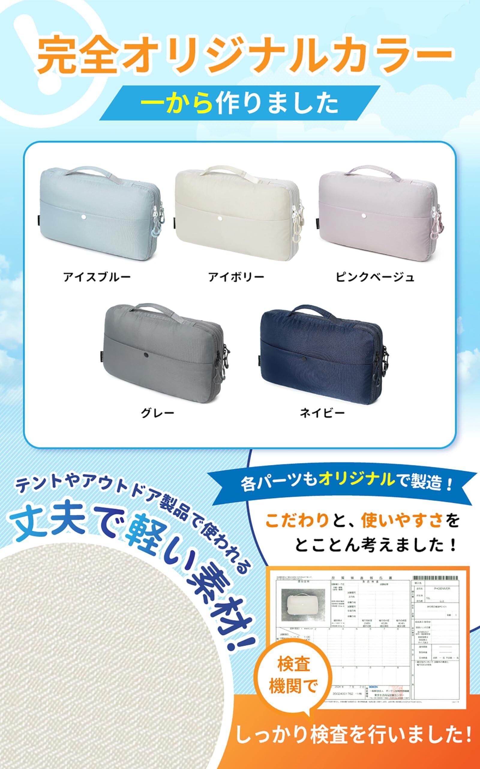 【丈夫な生地と縫製糸】圧縮ポーチは圧縮時は常にお洋服などの膨張負荷が掛かっているため、PHOENIVERの圧縮ポーチの生地はナイロン製がもちろん、縫製糸もナイロンを使用することで、生地や縫い目が破ける事の心配がありません!検査機構に依頼し品質検査もしっかりやりました!