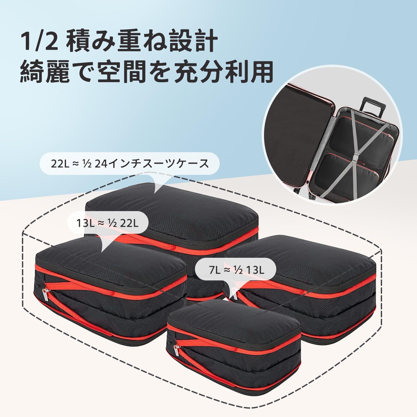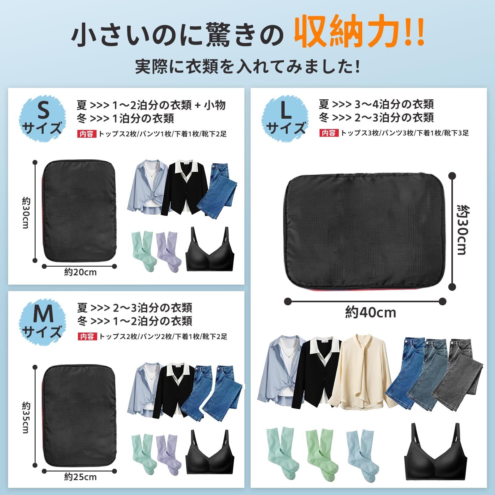 【様々なシーンで活躍】 旅行や出張だけでなく、衣替えでクローゼットの整理にも活躍します。畳んだ衣類をコンパクトに圧縮した状態で収納し、スーツケースや、クローゼットを綺麗に整理整頓できます。また、小物入れとしても利用可能で、アクセサリーや化粧品、電子機器などをまとめて収納することも可能です。