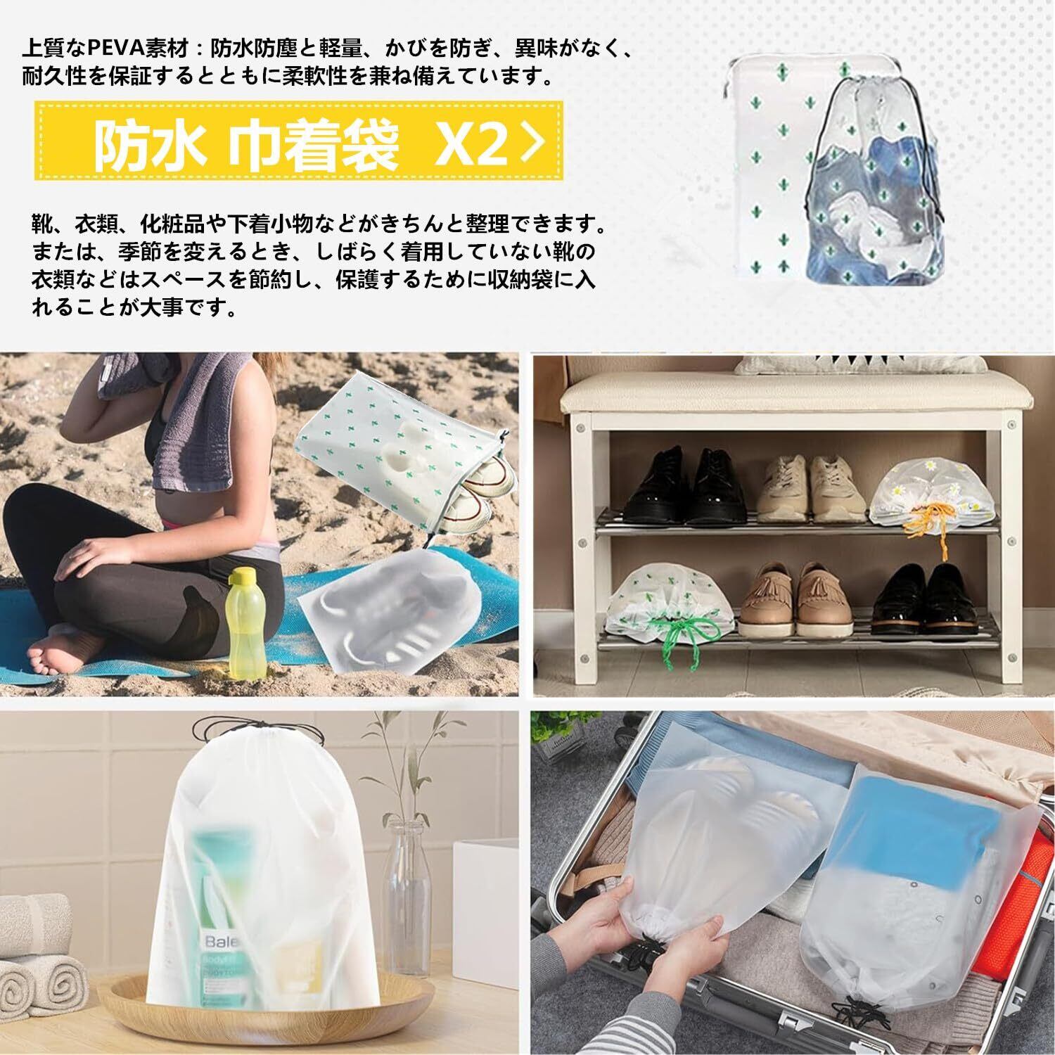 【トラベルポーチ 10セット】衣類収納ポーチ×4、化粧ポーチ×1、巾着ポケット×1、ファスナーポケット×1、シューズバッグ×1、防水袋×2。10点セットのトラベルポーチがあるから、細かく分けてすっきり整理でき、収納が抜群です。着ていない服衣類や汚れた衣類、洗面用具やシューズなども分けて衛生的に収納できます。