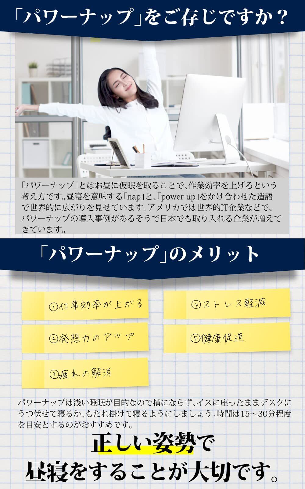 お昼寝や仮眠をとる際にデスクだと逆に疲れたり手がしびれたりするのを、昼寝枕を使っていただく事で快適な睡眠をとっていただけます