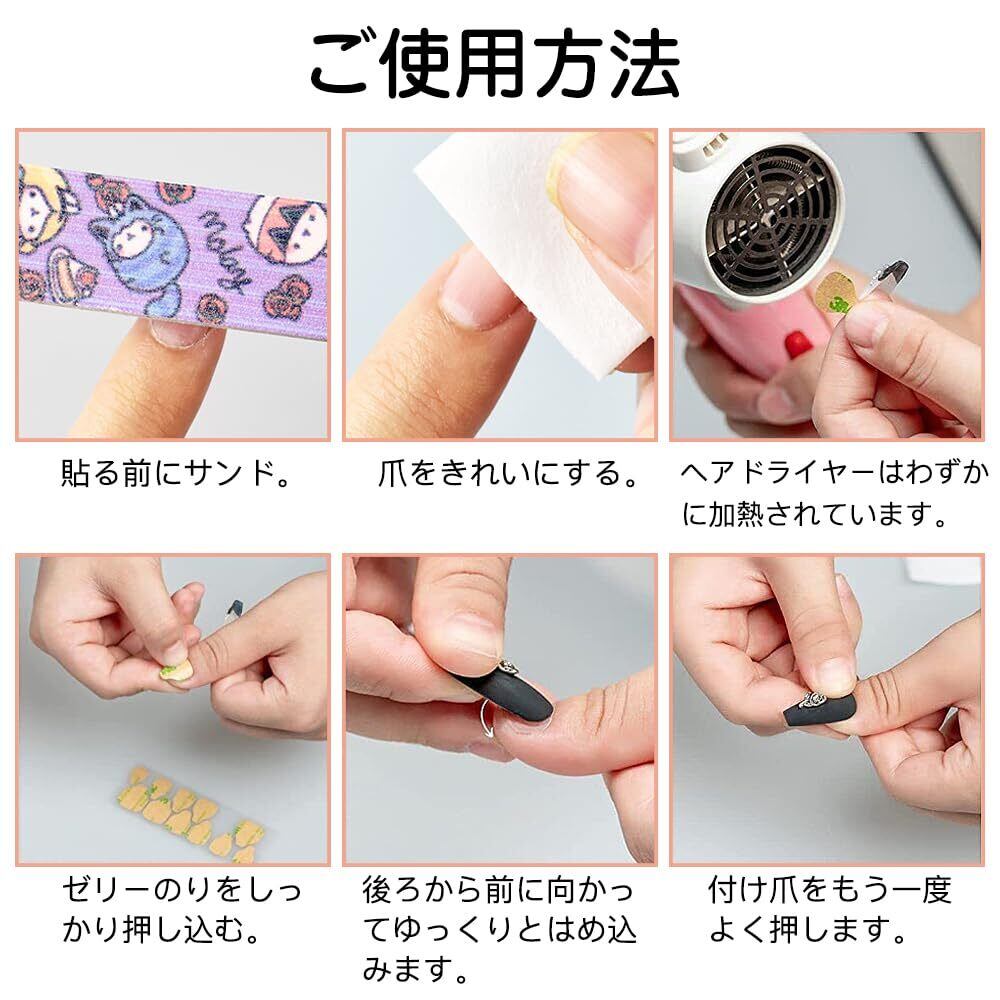 ご使用方法:爪の大きさに合わせてステッカーを剥がし、ネイルに貼り付けます。そして、保護フィルムを剥がし、爪のチップを貼り付け、数十秒間押し付けます。