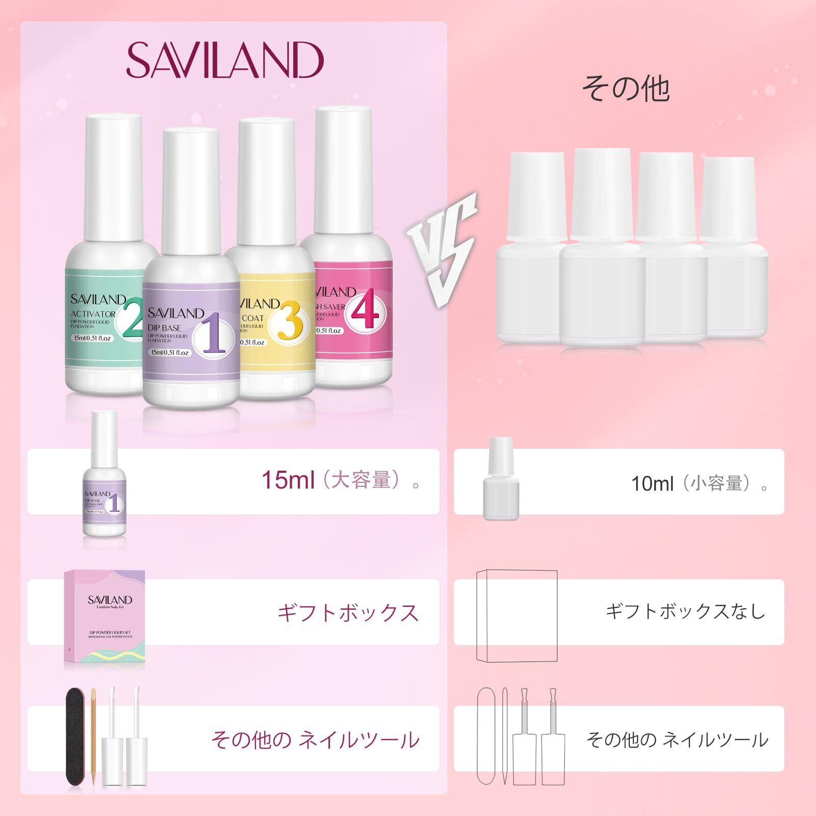 【自宅でDIYディップマニキュア】SAVILANDディップパウダーリキッドセットは、ディップネイルアートが大好きな奥様、お母様、ご友人に最適です。ディップパウダーリキッドセットを使用するときは、換気に注意してください。キャップを締めて保管し、ネイルディップ液を高温や直射日光から遠ざけてください。