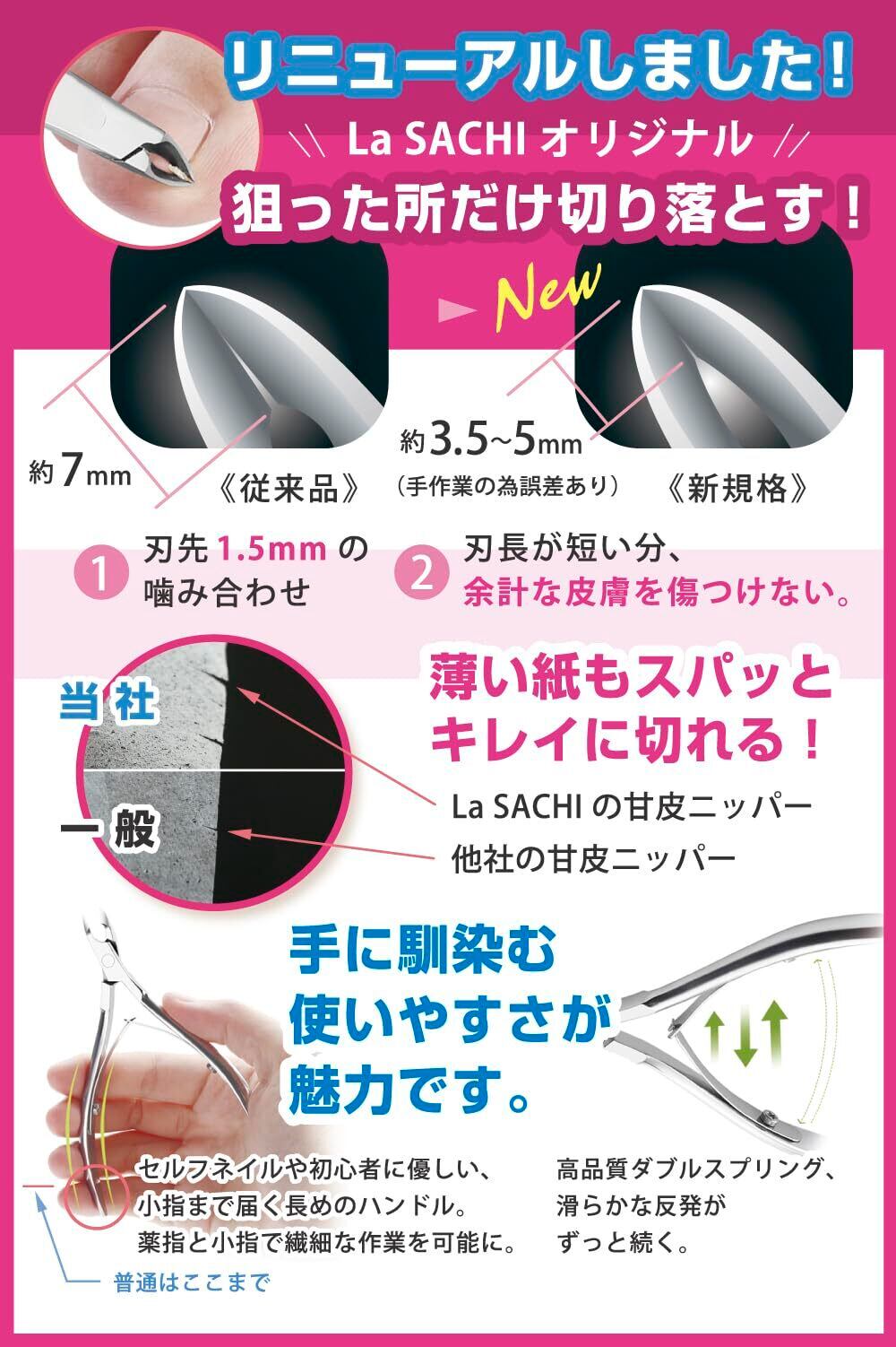 「 甘皮ニッパー 」は理美容専門のハサミ職人に監修頂きました。見た目どれも同じように見えるニッパーですが、使ってみればその差は一目瞭然。本当に良いものはストレスフリーな使い心地です。La SACHIの 甘皮ニッパー は滑らかなダブルスプリングのハンドル、左右の手ともに持ち易いよう長めの設計、厳しいテストにパスした切れ味、更に刃先を1.5mmの噛み合わせにすることで、余計な皮膚をひっぱったり、切り落とすことなく、細い甘皮やささくれを狙った箇所だけスパッと切り落とせます。