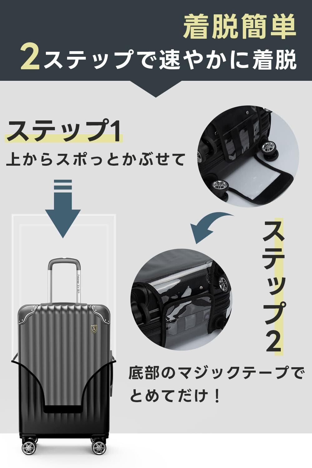 【取り付けも簡単】スーツケースの上から被せ、底部分の面テープで留めるだけのシンプルな設計なので、1人でもサッと装着できます。