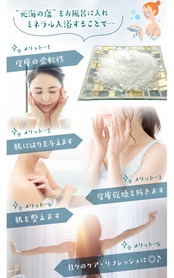 イスラエルの死海(塩湖)から採れる、ミネラル豊富な天然成分 海水由来の塩化マグネシウム(にがり成分)になります。死海の水を精製し、塩化マグネシウムを抽出して作られているので、塩(ナトリウム)成分は、ほぼ入っておりません。ミネラル入浴により、皮膚の柔軟性を保ち、肌を整えはりを与え、皮膚の乾燥を防ぎます。 着色料無添加・合成香料無添加・防腐剤無添加