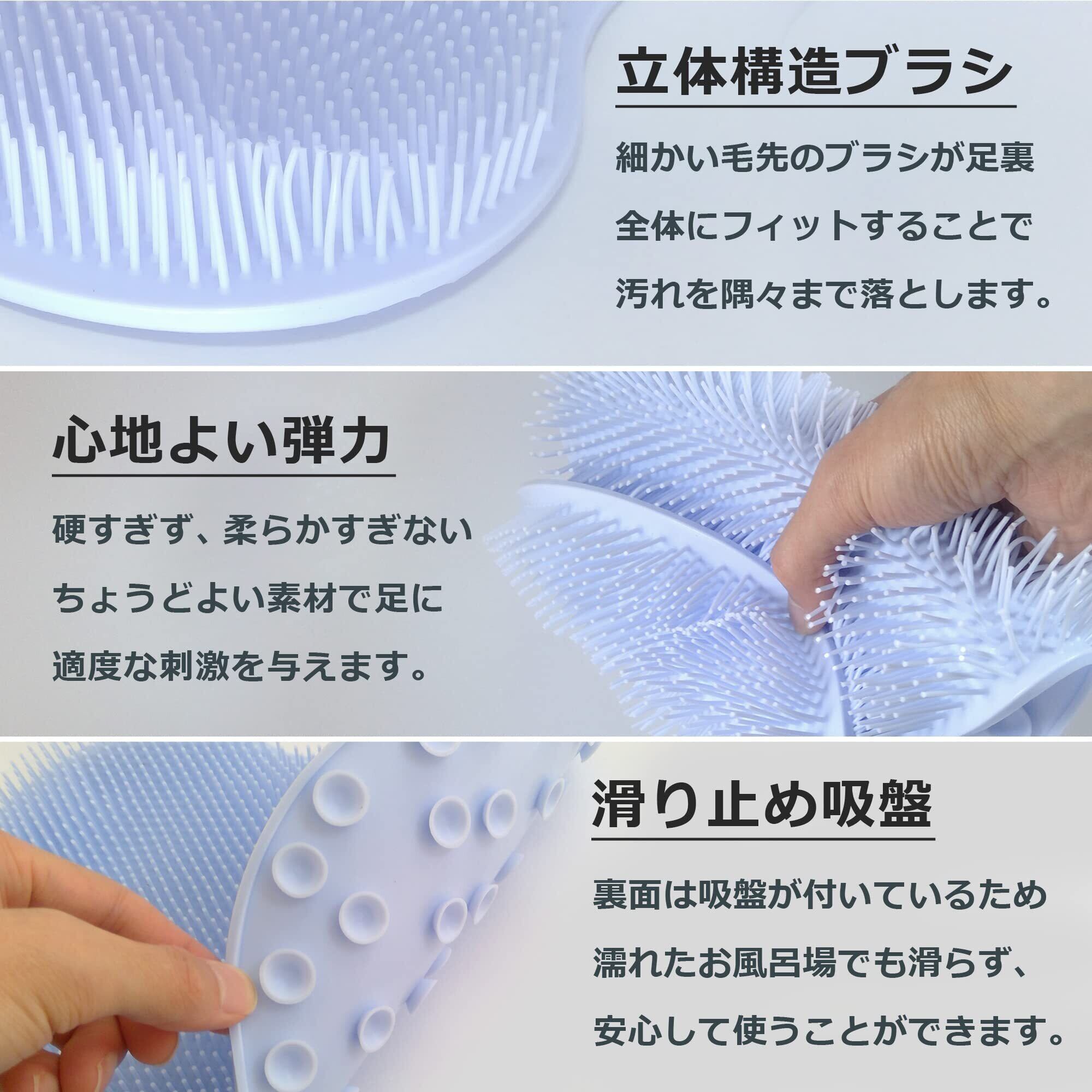 【特徴】 ・立体構造ブラシ 細かい毛先のブラシが足裏全体にフィットすることで汚れを隅々まで落とします。 ・心地よい弾力 硬すぎず、柔らかすぎないちょうどよい素材で足に適度な刺激を与えます。 ・滑り止め吸盤 裏面は吸盤が付いているため濡れたお風呂場でも滑らず、安心して使うことができます。