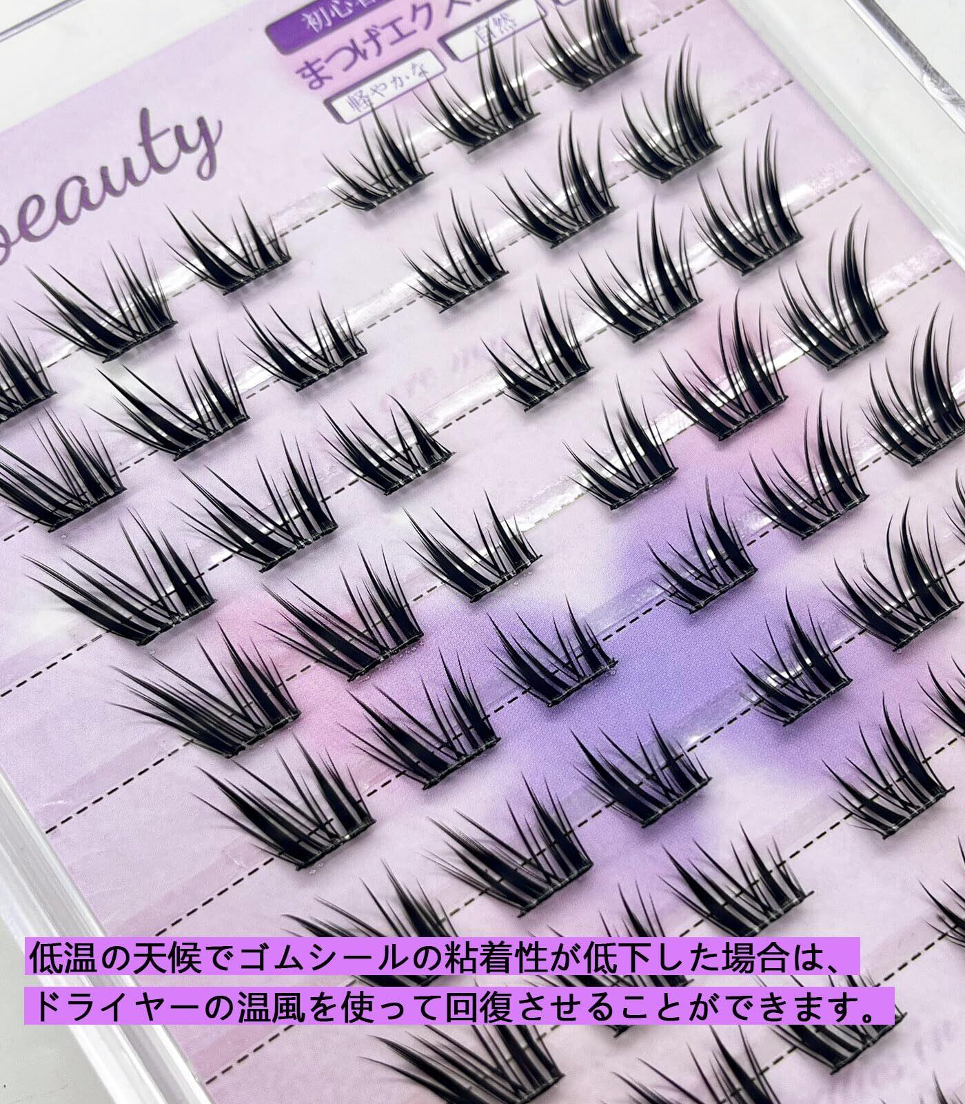 低温の影響でつけまつげの接着テープの粘着力が弱くなることがありますが、ご安心ください。ヘアドライヤーで軽く温めると、粘着力が回復します