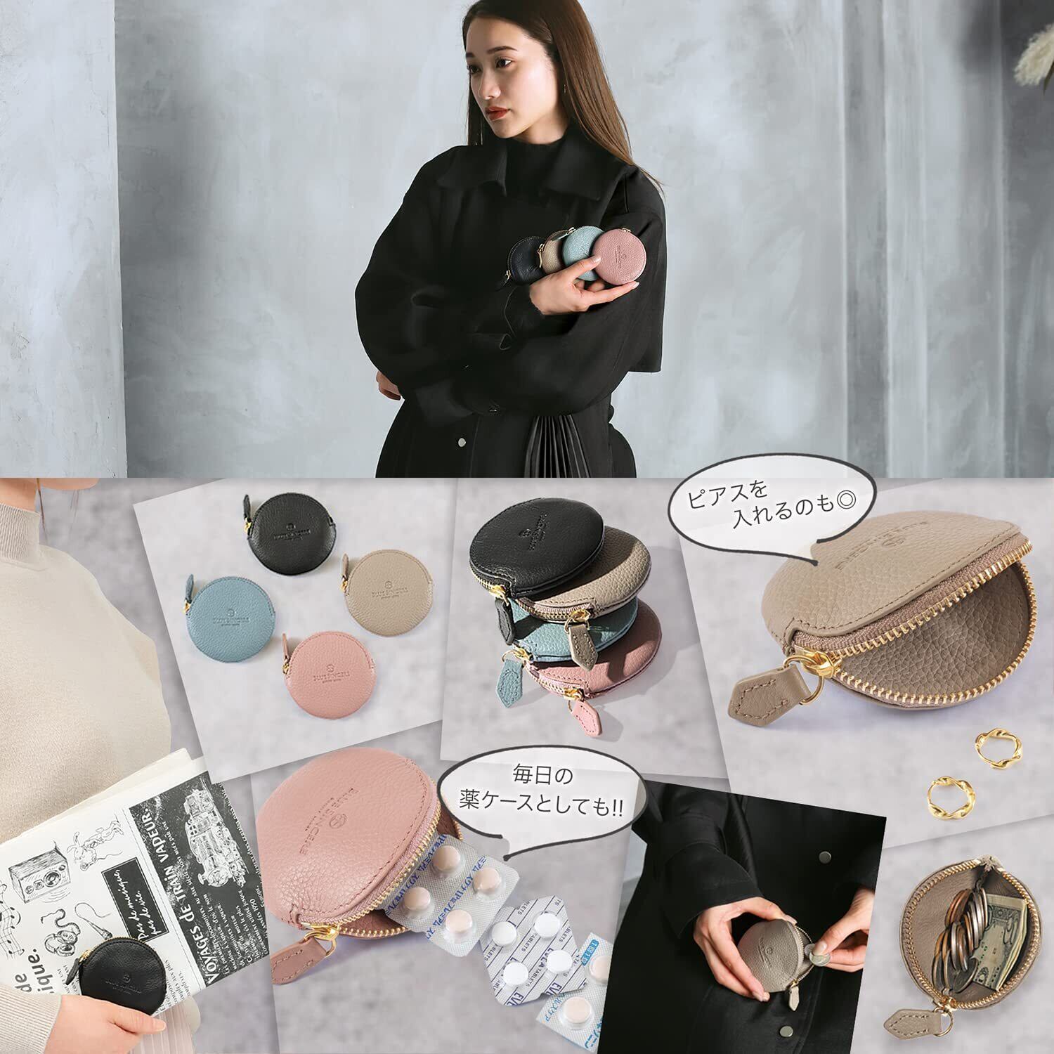 【 ガバッと開く開口部 】小銭やお札だけでなく、ピアスやネックレス、指輪など小物系を収納し、スムーズに取り出しやすくするためにファスナー部分は180度まで広げました。これにより、ガバッと広げ、手のひらにまとめて出すことで日常のストレスを無くすことができます。