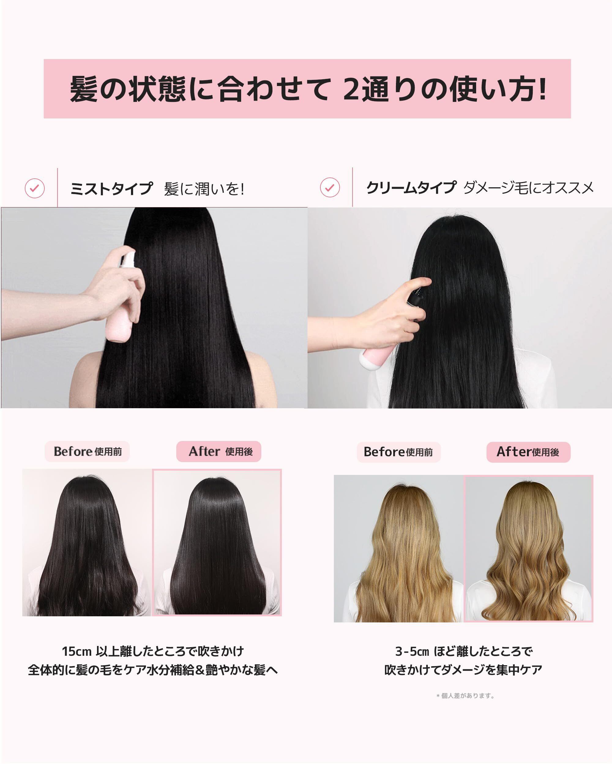 【ご使用方法】乾いた髪や濡れた髪にまんべんなく噴射しなじませます。 特にダメージが気になる部分には、近くで吹きかけてクリームパックで集中ケアをしてください。