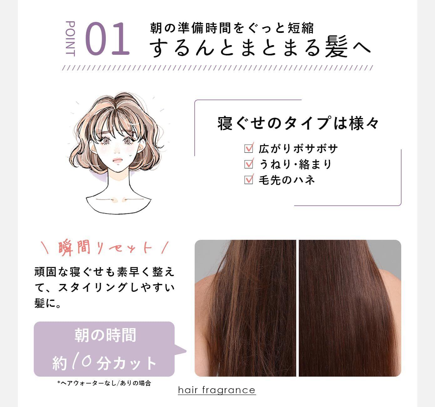 【 瞬間、まとめる 】潤い成分のたっぷり入った ヘアウォーター を髪にひと吹きするだけで、毛を柔らかくし、スタイリングしやすい髪にします。
