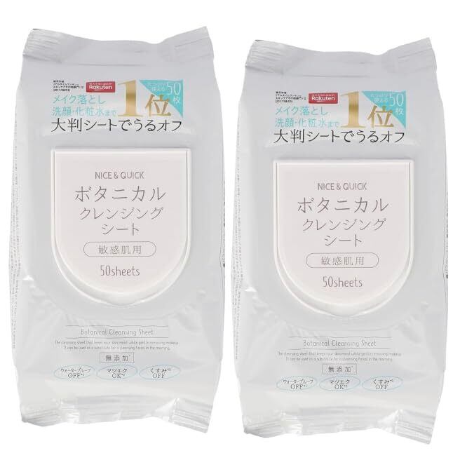 【新春セール】【まとめ買い】クレンジングシート アルコールフリー ナイス&クイック ボタニカルクレンジングシート 50枚 無添加 ナイスアンドクイック 敏感肌 メイク落としNICE&QUICK 時短 (2個, 白)