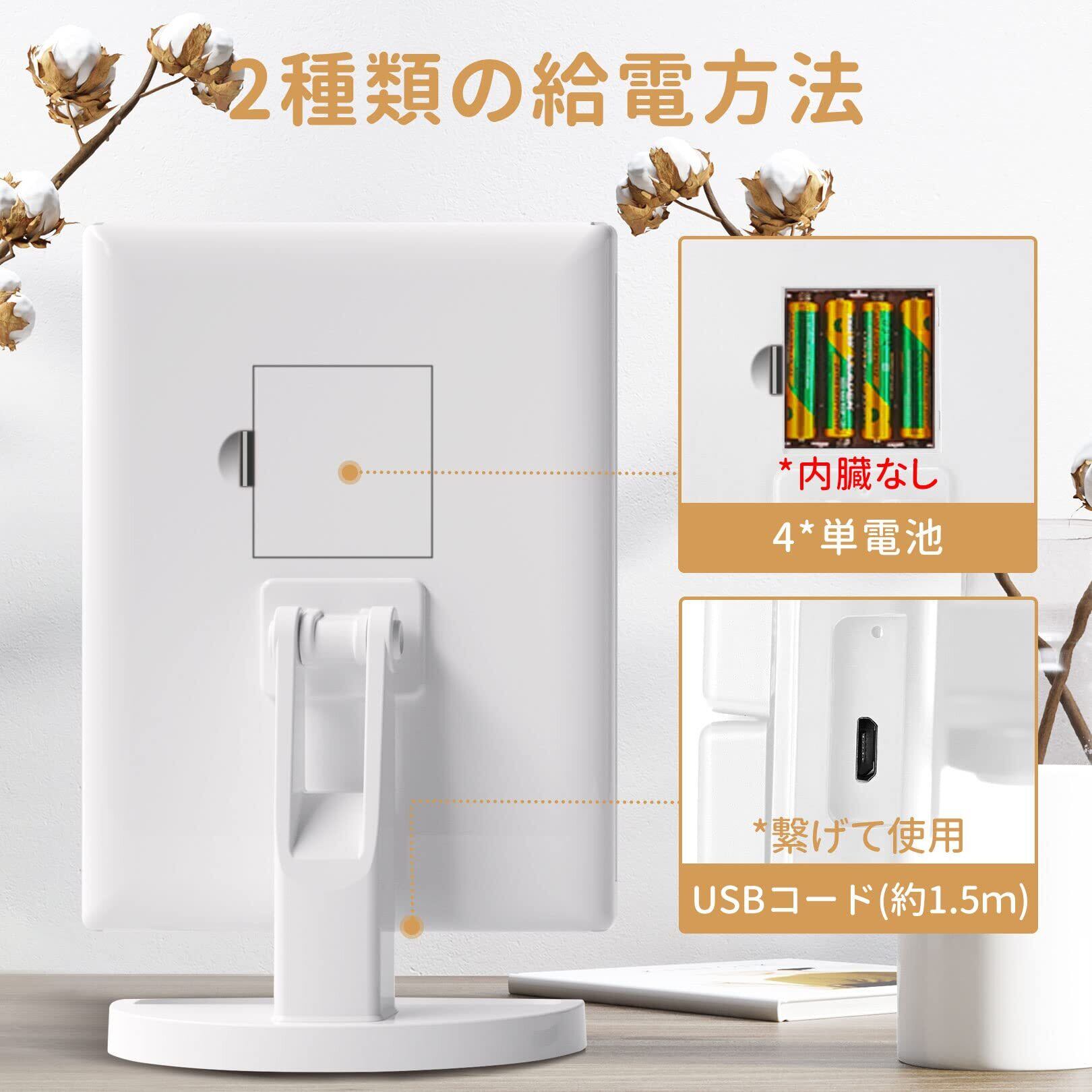 【選べる2WAYタイプ USB or 電池】折りたたみ式女優ミラーは、外出先で電源が確保できない時は、単4電池4本(別売り)をセットすると場所に関係なく利用できます。USB電源がある環境では、USBケーブル(付属品)を使用し照明を利用できます。電源が確保できない環境でも自由にどこでも女優鏡を使用できるのでメイクがとても楽しくなります!USB給電を利用する場合は念のため電池を外しておくことを推奨します。