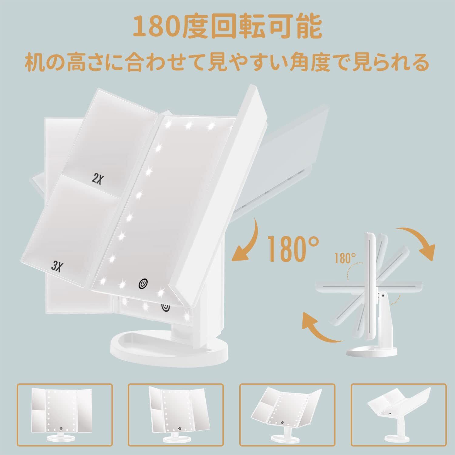【2倍&3倍の拡大鏡付き】立体三面ミラーですのでお顔の正面だけでなく、横顔や顔全体をしっかり確認することができます。2倍&3倍の拡大鏡により、明るく細かい毛穴の状態を隅々までチェックでき、全体のバランスを確認しながら細やかな化粧をサポートしてくれます。