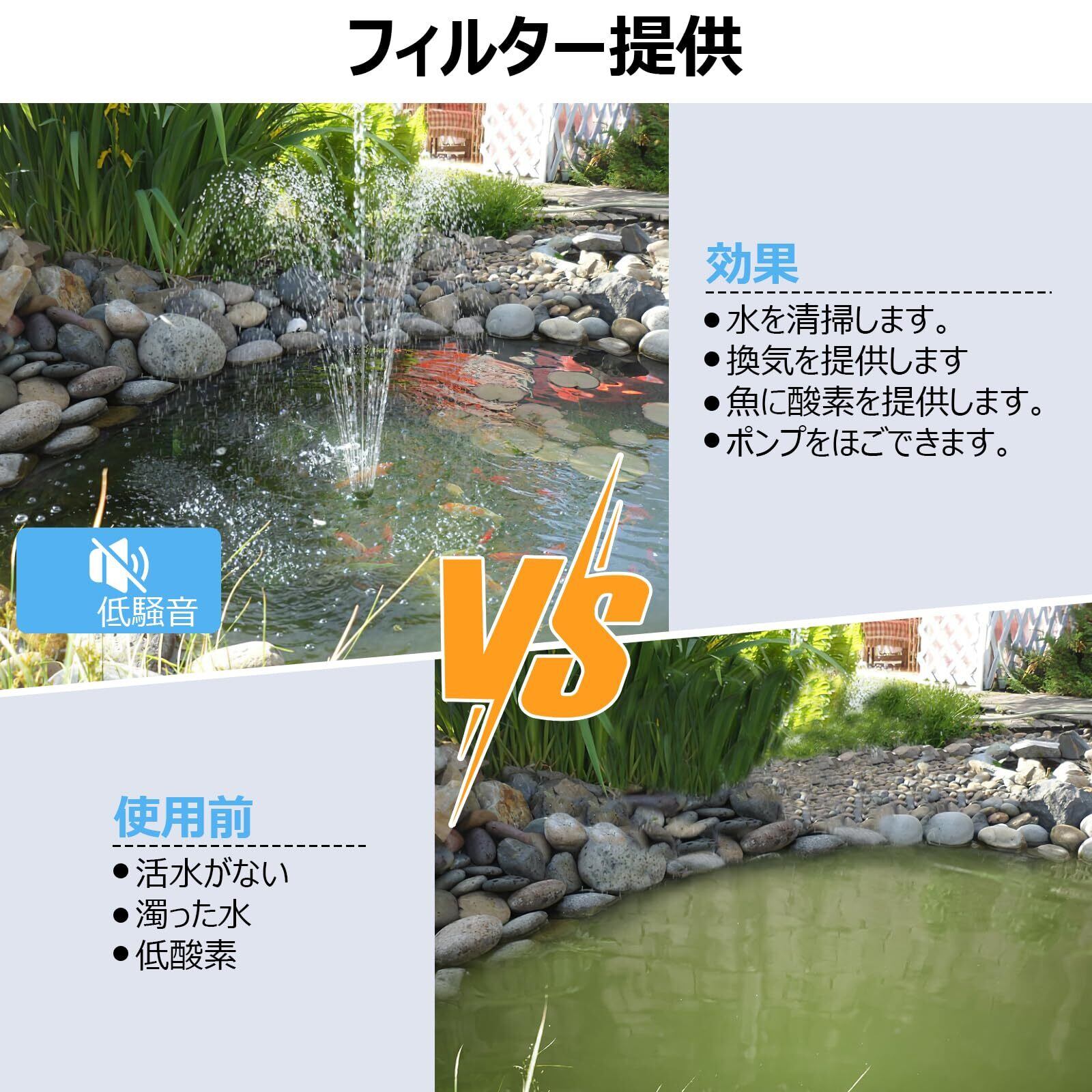 【強力なウォーターポンプ】ウォーターポンプの最大水出力は 660GPH で、200 ガロンを超える小さな池に適しています。パッケージには 3 つのスプリンクラー ヘッドが含まれており、池の面積に応じて適切なスプリンクラー ヘッドを選択できます。