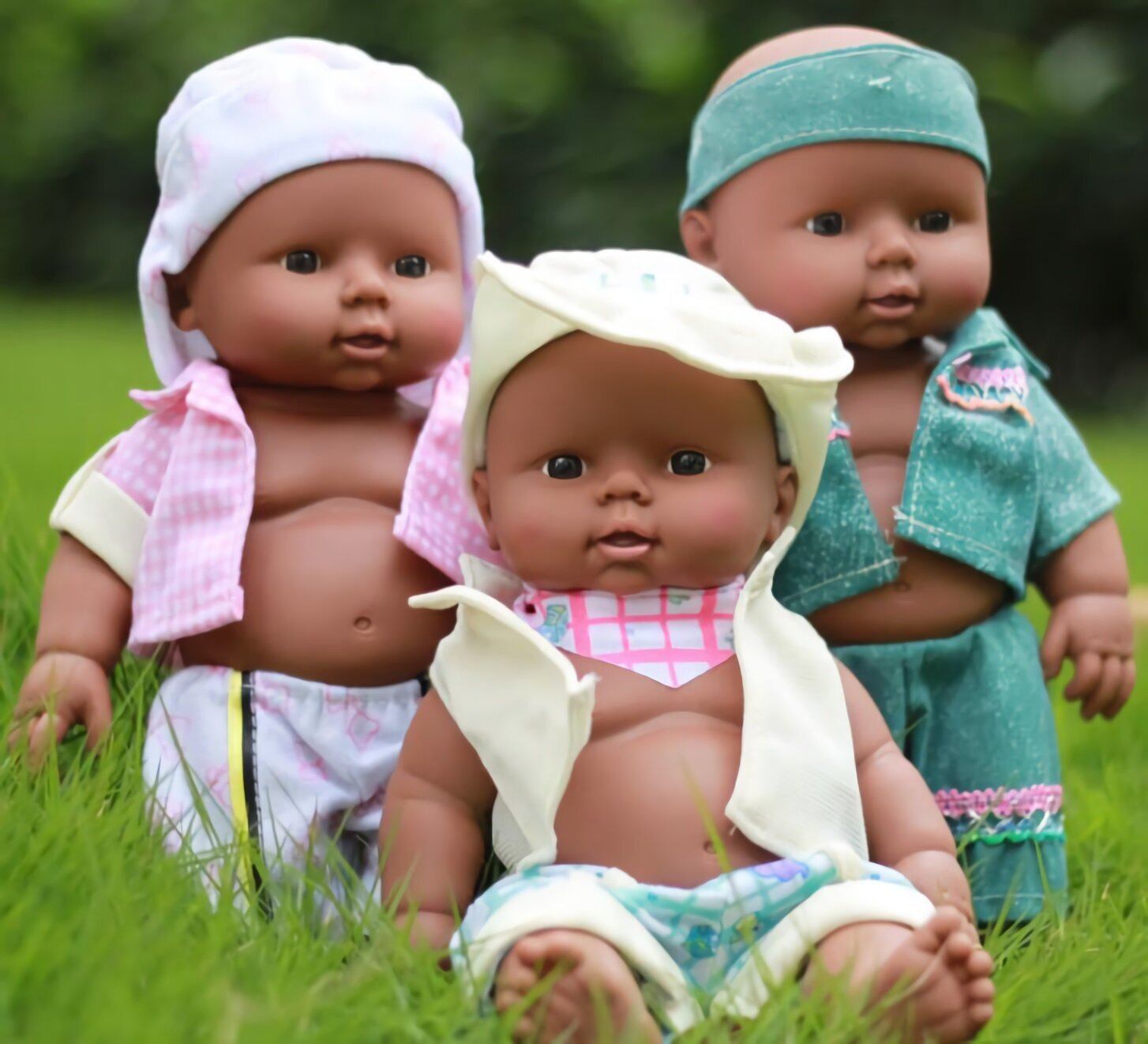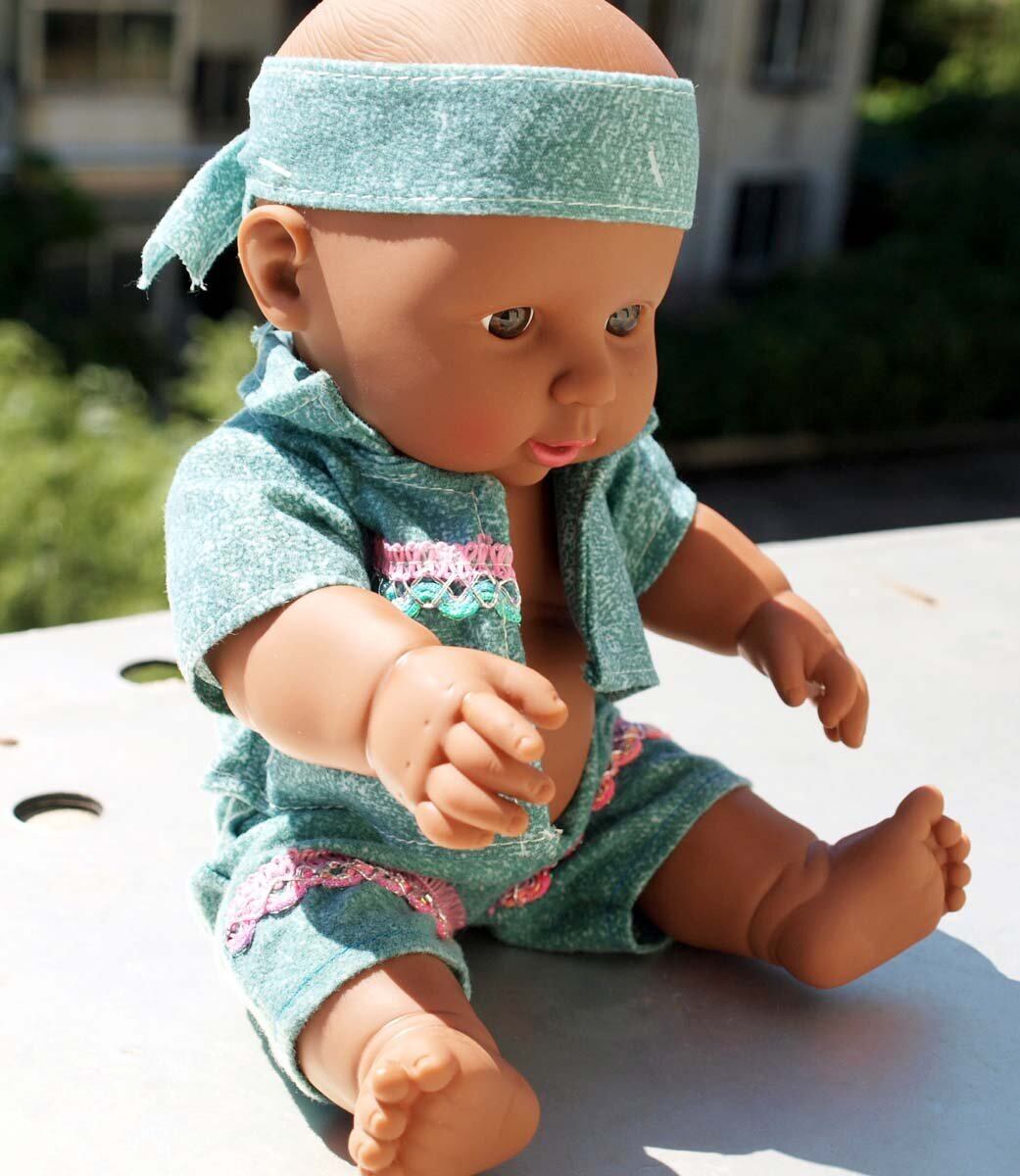 身長が約30cm、体重が約0.3kg、かわいいお洋服と帽子付きの黒人さん赤ちゃん人形です。