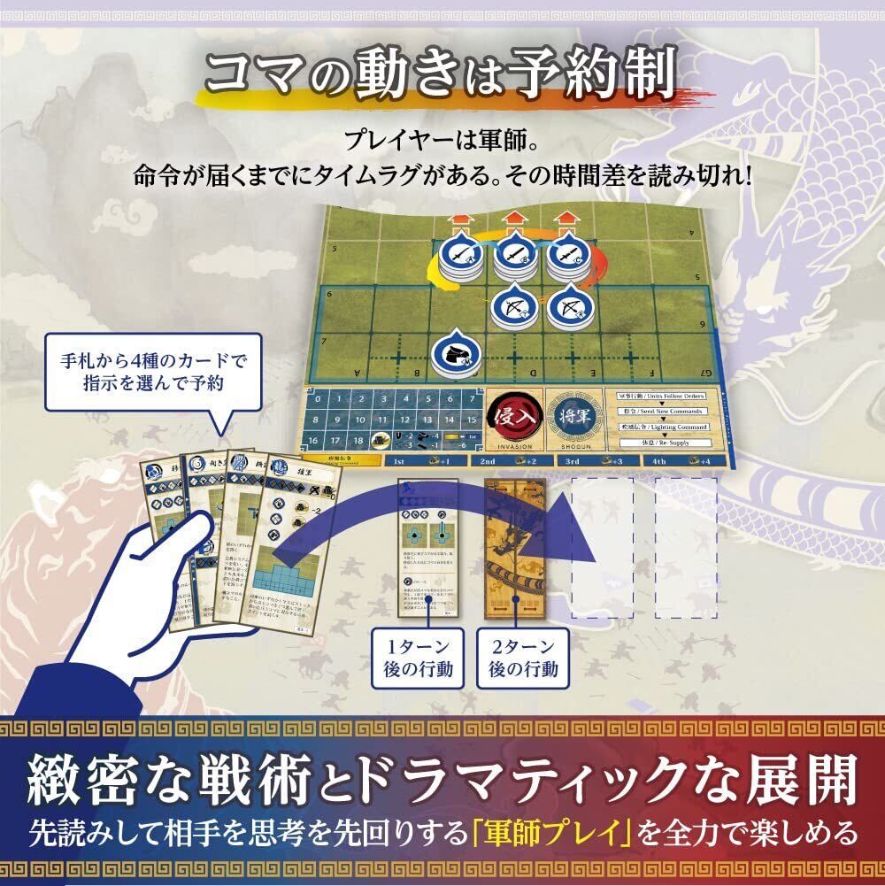 内容物(コンポーネント):2つ折りB4ボード1枚,兵士コマ(木製)34個,柵コマ(木製)8個,木製キューブ2個,基本軍略タイル14枚,発展軍略タイル18枚,将軍決定タイルチップ24枚,サマリーシート1枚,説明書1冊