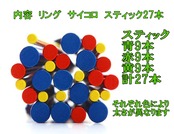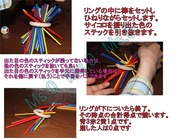 【遊び方】スティックを束をリングの上から通して中心まで下ろし、倒れないようにセットします。全体が安定したら、ゲーム準備が完了です。プレーヤーは順番にサイコロを投げでた色のスティックを、全体が崩れないように注意しながら抜き取ります。全体が崩れたら(または、スティックが残り3本になった場合、)ゲームは終了し、最も得点が高い人は勝ちです。(青1本3点、赤1本2点、黄1本1点、最後にとったスティックの点数は計算対象外です。)