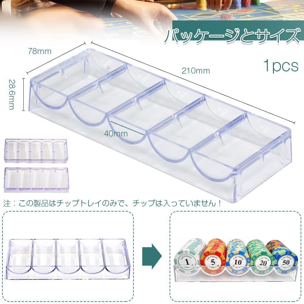 セット内容:収納チップオーガナイザー1本セット;収納箱サイズ:210*78*28.6 (mm);個別グリッドサイズ:約40mm;各箱は20*5=100チップを収納できます。注:この製品はチップトレイのみで、チップは入っていません!
