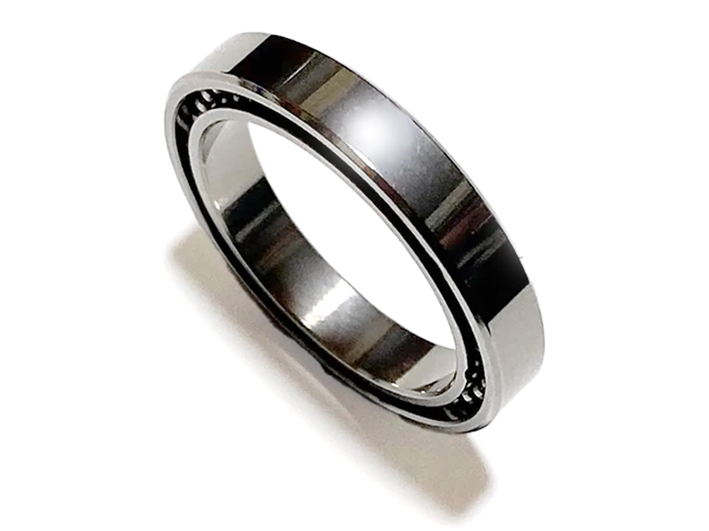 【なめらかに回る。高品質】 2つのステンレススチールのリングの間に同じくステンレスチールの球があることで、摩擦が少なくよく回ります。 内側のリングも外側のリングもはなめらかに表面が処理されたステンレススチールです。耐久性があり、長期間にわたって美しい状態を保ちます。磁石につかないのはニッケルを含む多くのオーステナイト系のステンレスです。この指輪は強度・硬度にすぐれたマルテンサイト系のステンレスで磁石につきます。
