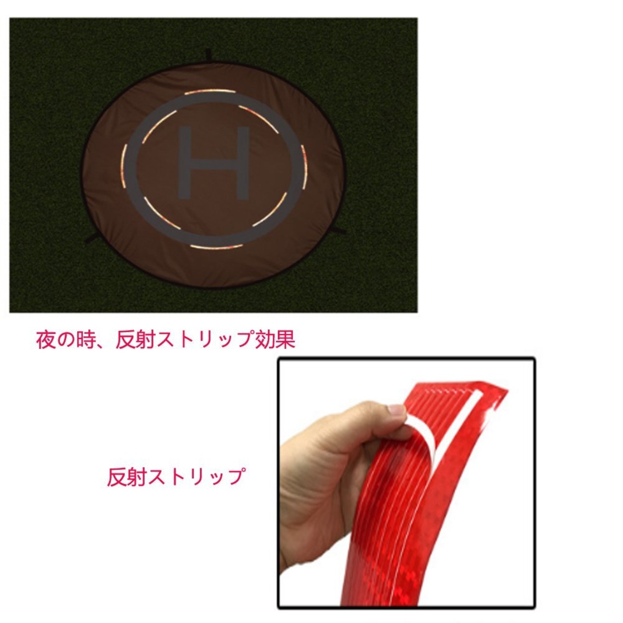 パッケージ内容:1pcs * 55cm 折りたたみ式防水ドローン着陸パッド + 3根 * プラスチックネイル + 1pcs * ポータブル収納袋 + 8枚 * 発光ライン。