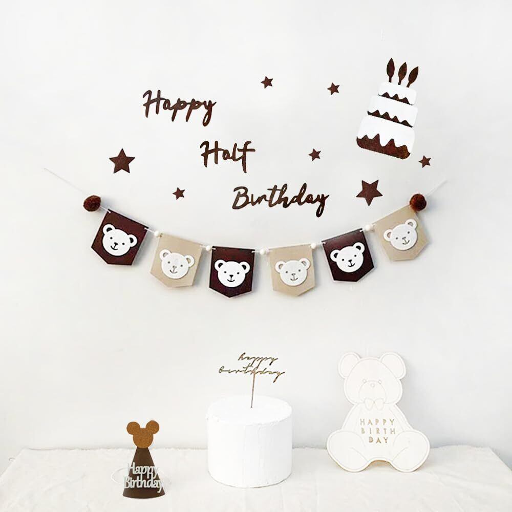 【特価商品】ハーフバースデー 誕生日 飾り 可愛い 1/2歳 誕生日 飾り付け セット 女の子 男の子 高級生地 壁に飾る用のhappy half birthdayフェルト生地バナー、かわいいクマのフェルト生地フラッグガーランド、ケーキ、パーティー帽子、フグボールガーランド、 バースデー 飾り 大人 写真背景 子供 飾り お祝い Half Birthday Party Decorations