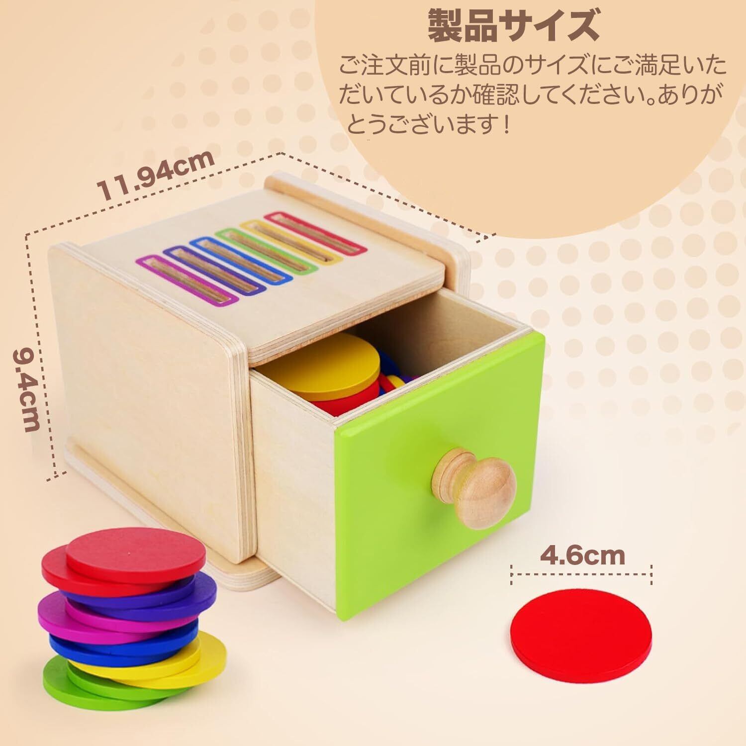 色の分類:6つの高品質木製ブロック、6色:赤、黄、青、緑、ピンク、紫、この木製の引き出し型早期教育玩具は、引き出しの把握補助段階を通じて、12-36ヶ月の幼児の運動スキルと認知発達を高める。