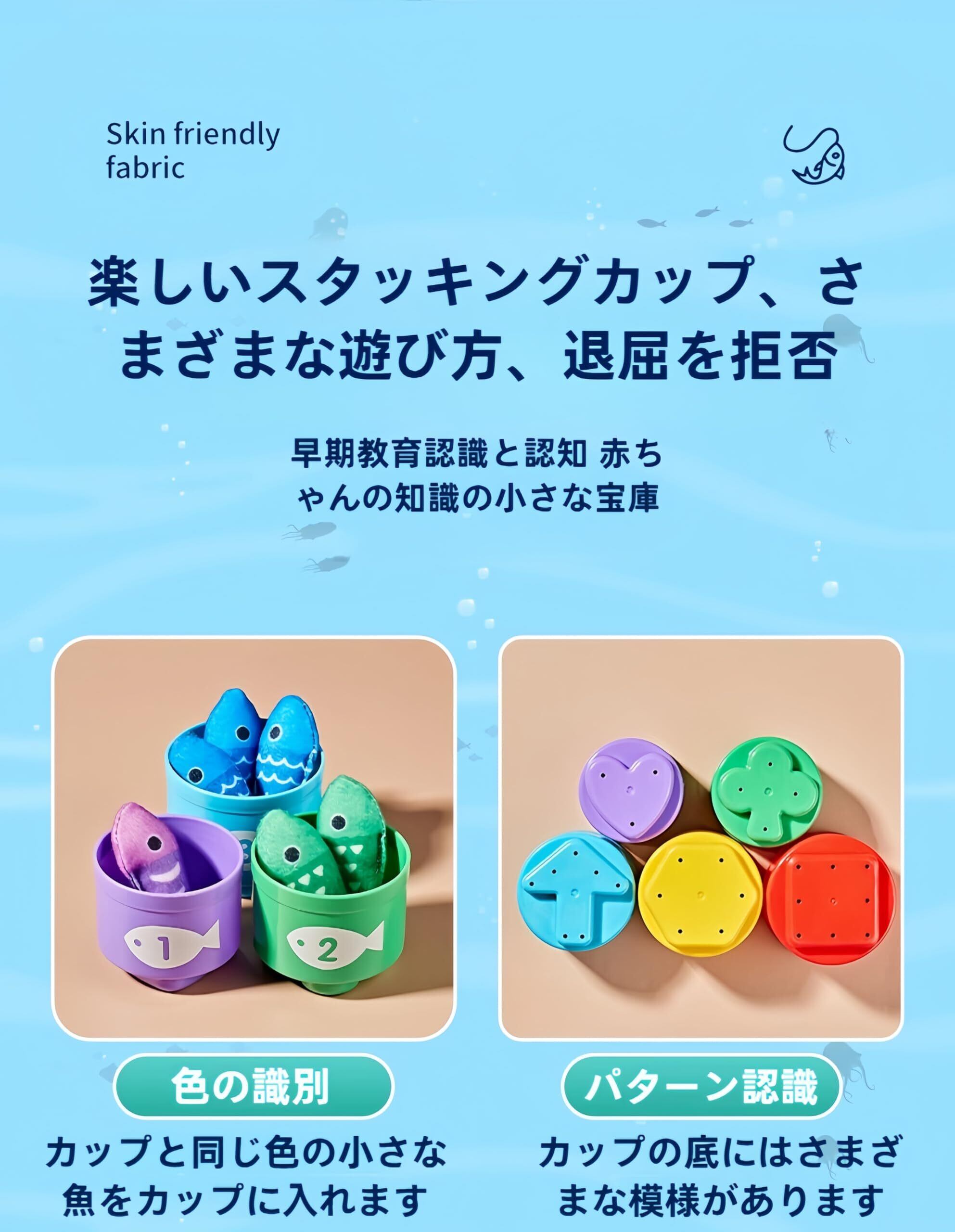 【日本企業】VCYCTO モンテッソーリ 知育玩具 男の子 女の子 22 in 1 釣りおもちゃ 布製釣りゲームセット 型はめ 形合わせ 早期開発 指先訓練 1-4歳向け 出産祝い 入園お祝い 子供の日 誕生日 積み重ねカップ付き 数える 色分け 形の認識を学べる 男の子 女の子に人気 (青)