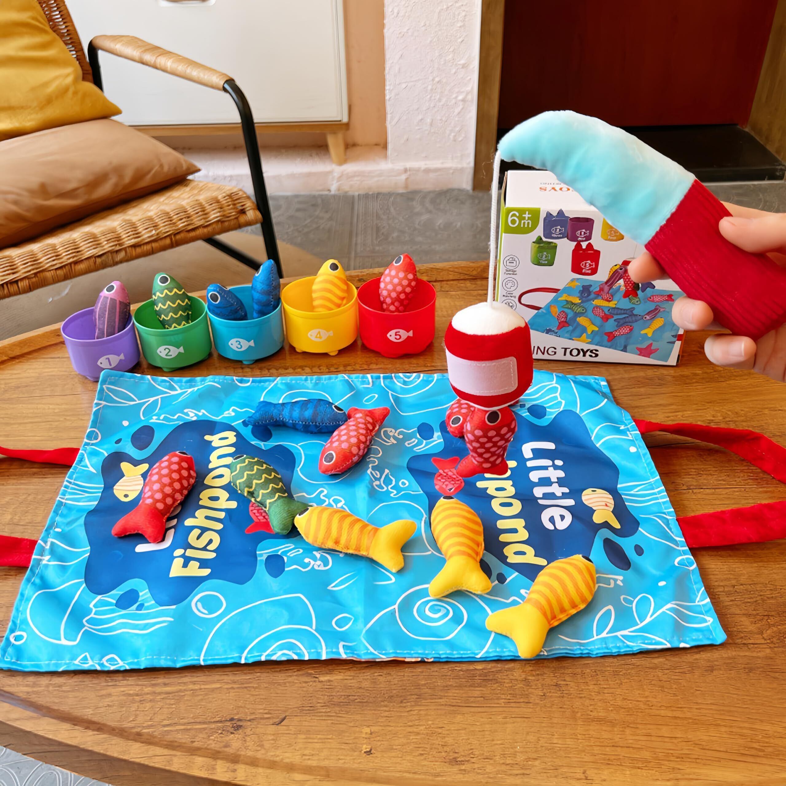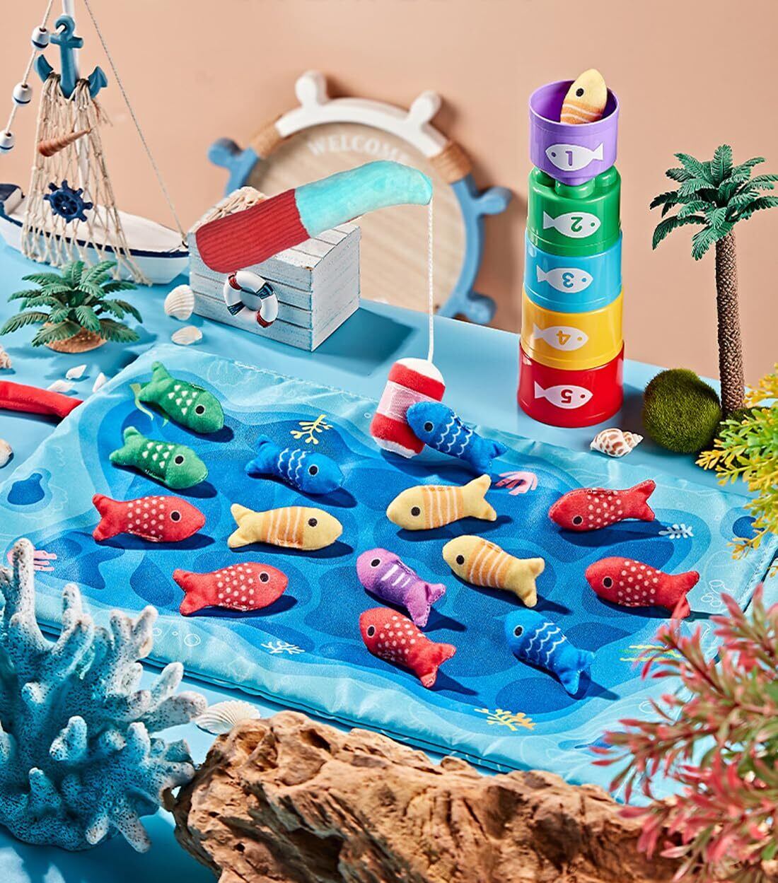 【モンテッソーリ風知育玩具 フィッシングセット】 22点セット、フィッシングポール、15匹の魚、5個のスタッカブルな魚のバケツ、収納バッグとしても使える海洋マットが含まれています。知育玩具として幼児の好奇心を引き出し、実践的な学びと積極的な探索を促進し、スキルの発達をサポートします。ソフトで幼児向けの布製フィッシングおもちゃで、初めての釣り冒険をお子様に体験させてあげましょう