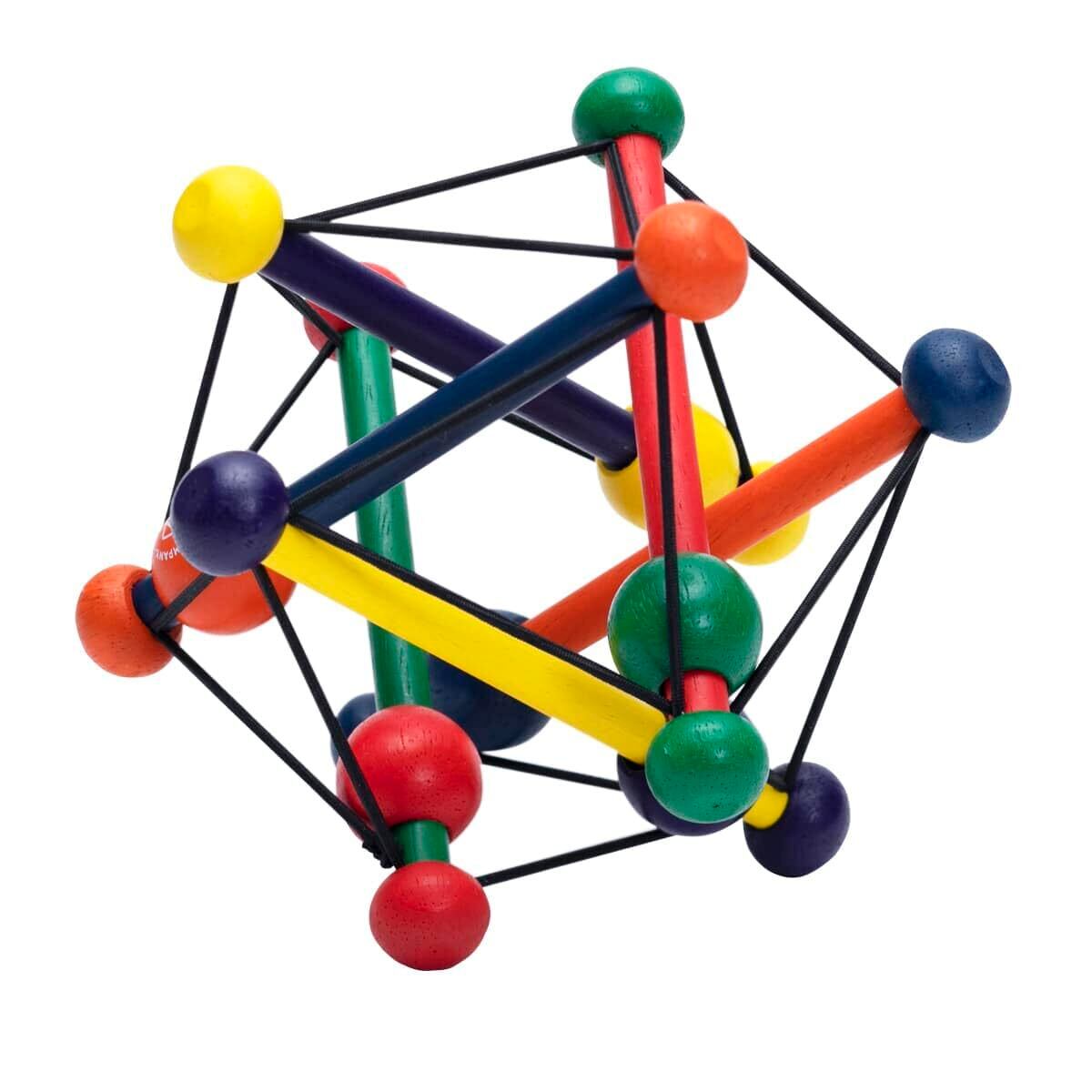 木の棒とゴムのひっぱり合う力でバランスを保ち、小さな手でも握りやすいデザインと、どこから力を加えてもつぶれ、元に戻る様子が赤ちゃんの好奇心をくすぐります。