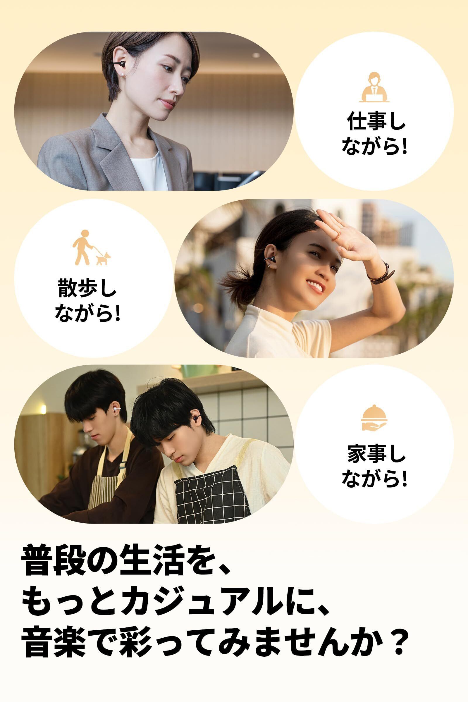 【物理ボタンの採用で誤操作を解決!】操作は完全ワイヤレスイヤホンで一般的なタッチ方式ではなく、誤操作が少ない物理ボタン方式を採用しました。ボタンは耳の後ろに配置されているため、少し触れただけで反応してしまう心配がありません。音量や各種機能はボタンの操作で簡単に切り替えでき、会話中や電車内など、さまざまなシーンで活躍します。
