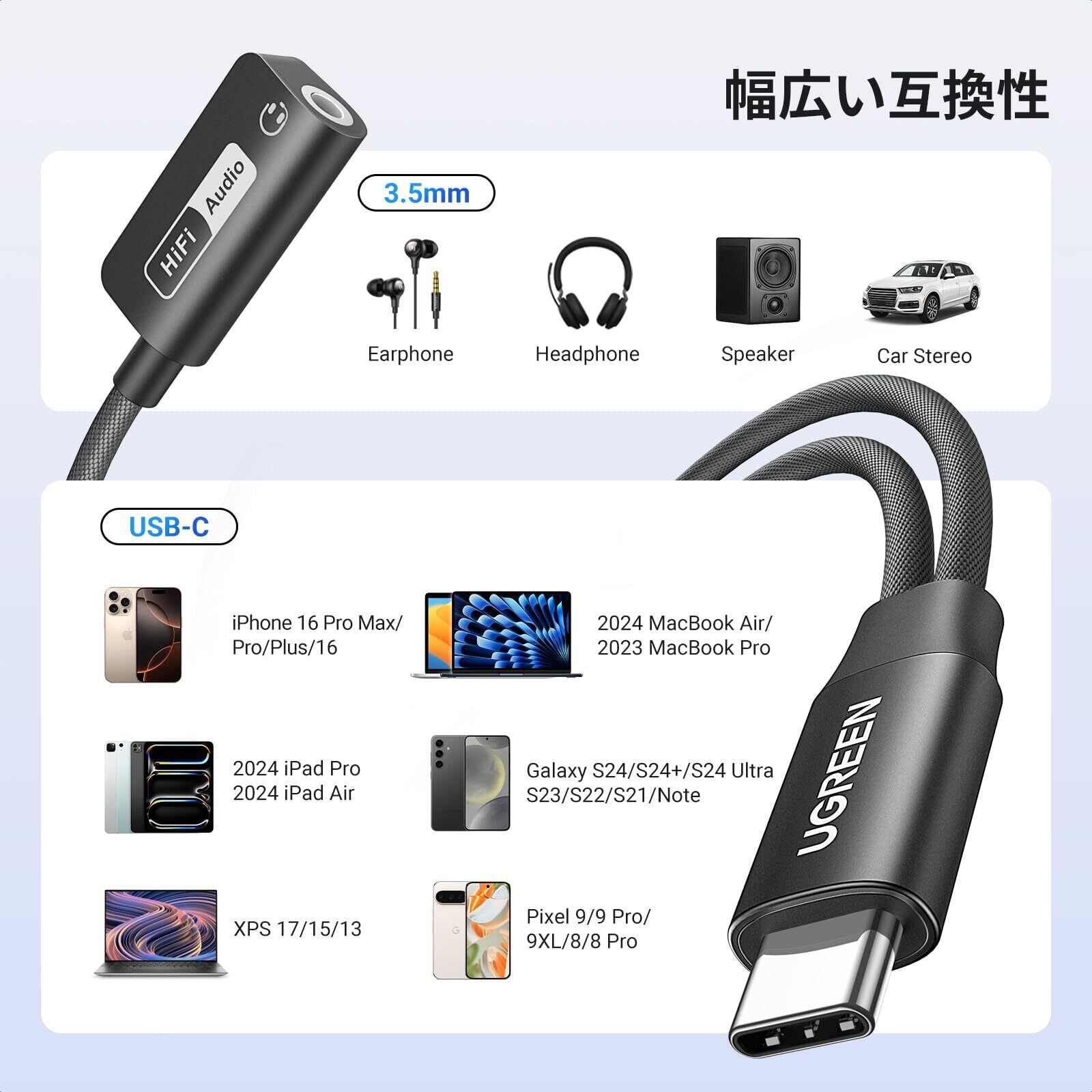 UGREEN USB-C to 3.5mm オーディオ変換アダプター タイプC イヤホン 変換 PD 60W 高速充電 DAC搭載 Hi-Res 32Bit/384KHz iPhone 15 Pro Max Galaxy S24 Ultra Pixel 8 iPad Pro/Air等適用