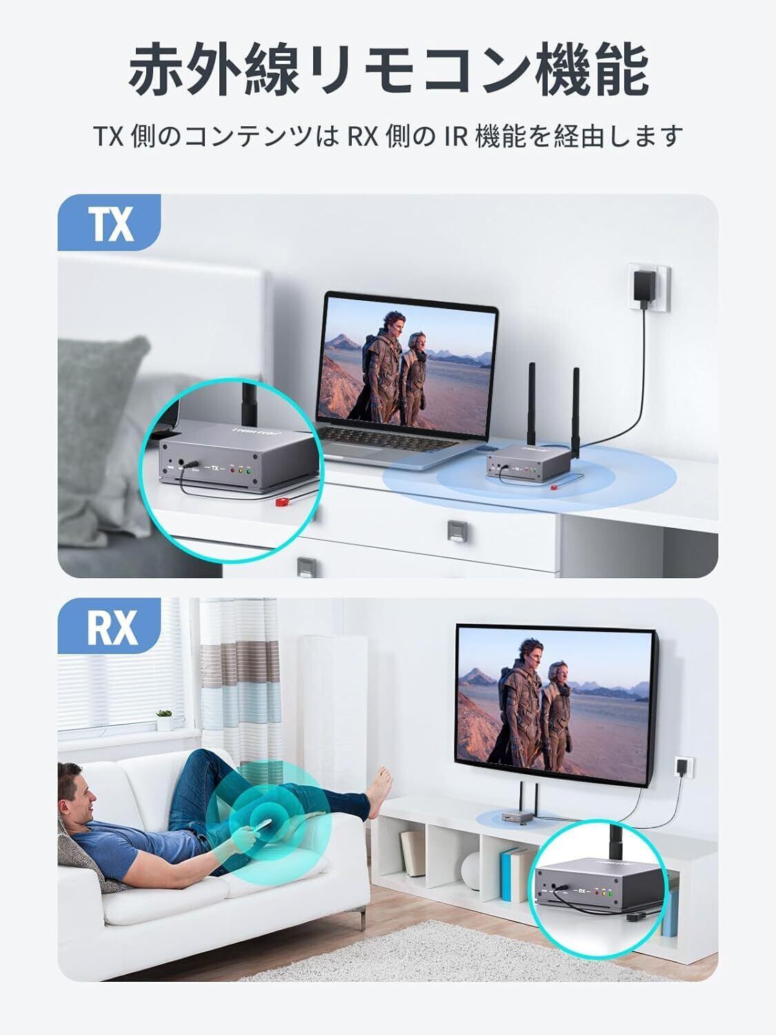 【IR赤外線リモコン対応】 HDMI 無線 送受信機 はIRリモコン機能を搭載しており、リモコン信号を認識することが可能です。これにより、ベッドルームからリビングのテレビを遠隔操作して電源をオフにしたり、チャンネルを切り替えたりといった遠距離操作が可能です。また、1階のテレビ信号を受信し、2階で同じ映像を視聴できるため、見守り用途としても活用いただけます。