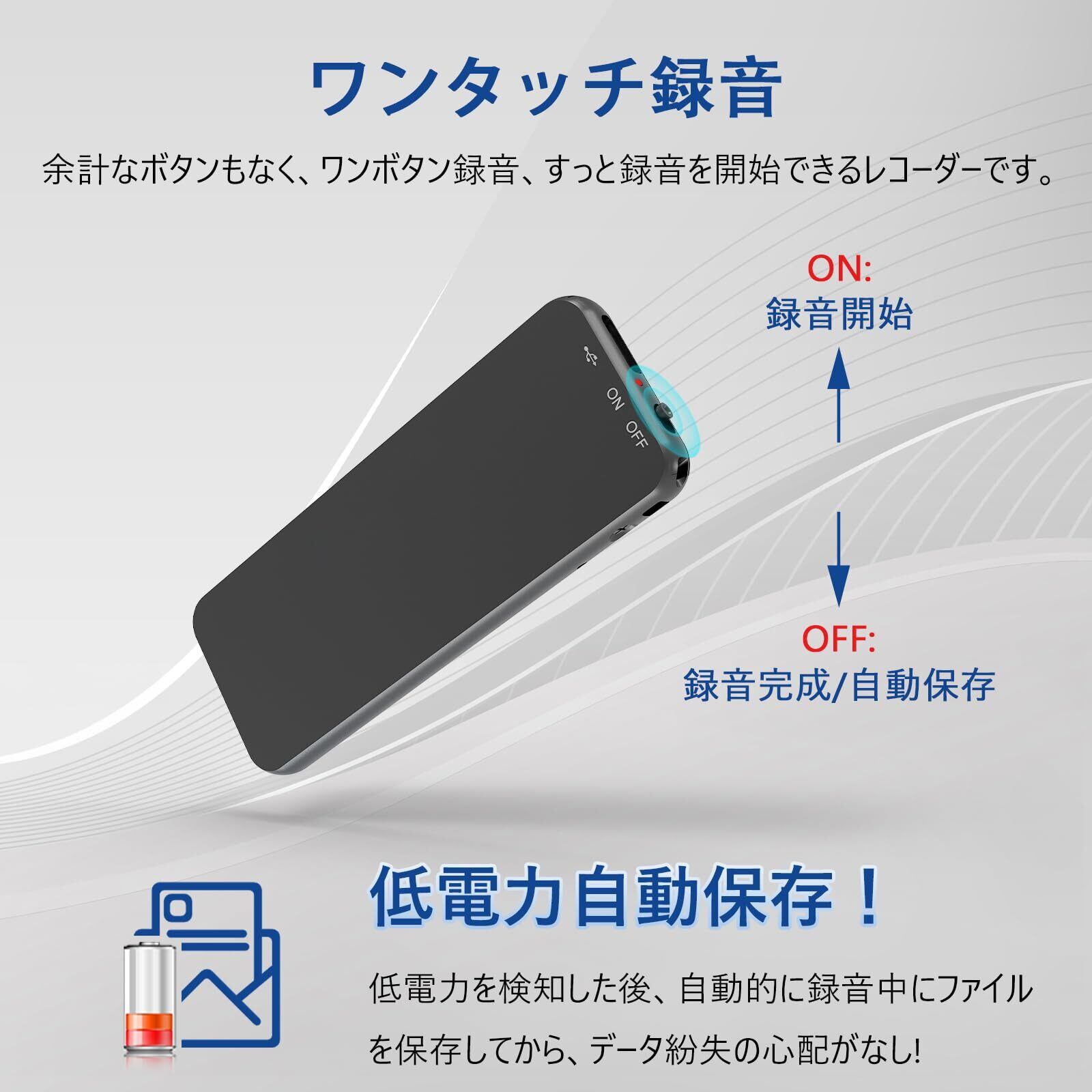 【ワンタッチ録音・保存】ボイスレコーダーをONにスライドさせるだけで、LEDライトが点滅すると録音が開始され、OFFにスライドさせると1536--32kbpsで録音が保存されます。自動保存機能も搭載して、電量がなくなる前に自動的に録音中のファイルを保存することができます。煩雑な設定手順を省き、操作簡単、録音だけに集中できます。