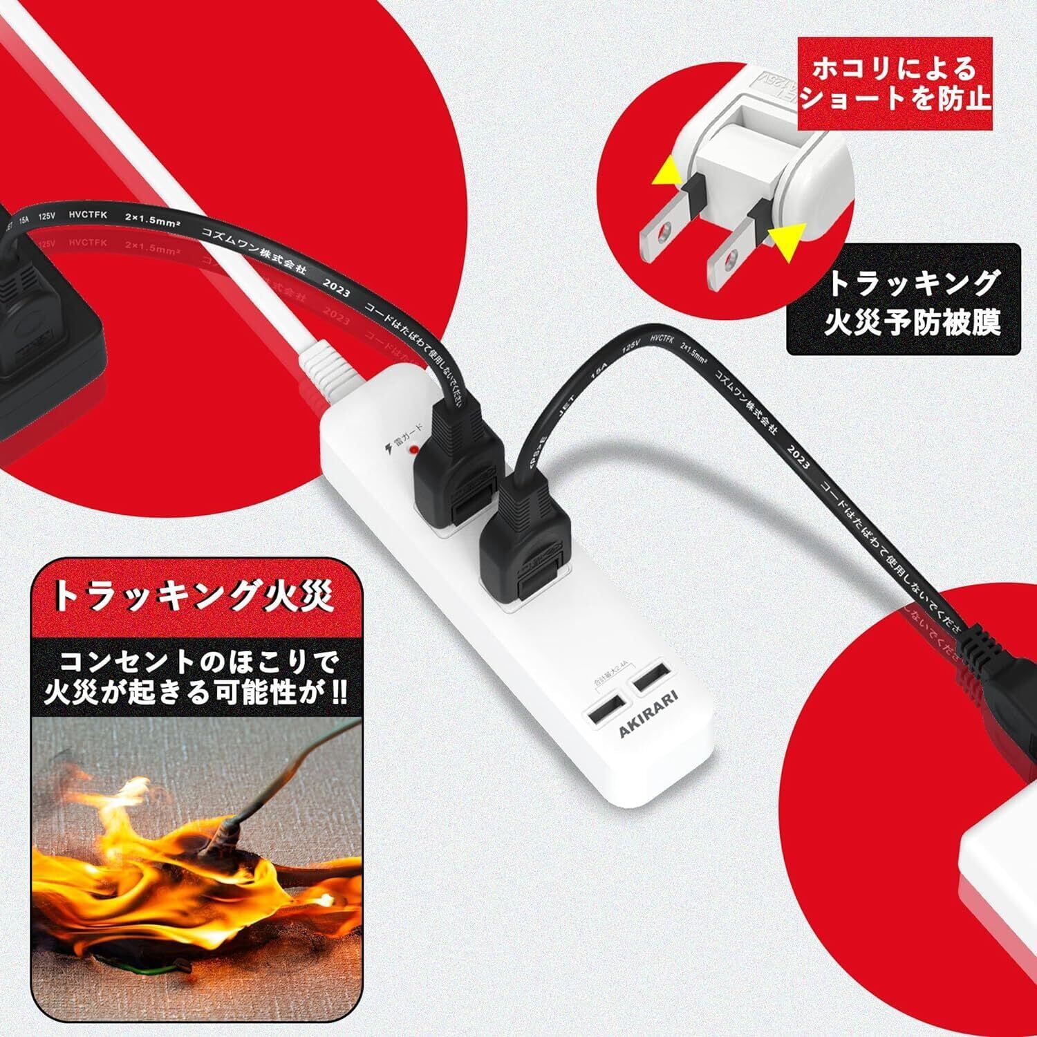 AKIRARI 延長コード 2m 電源タップ 1個口 【断線に強い】 耐寒 耐熱 ブラック 15A 1500W 二重被覆 延長ケーブル 電源延長コード トラッキング 火災予防絶縁キャップ スイングプラグ ソフト 0.1m~10mまで選べる 電源コード すっきり配線 RoHS 省スペース