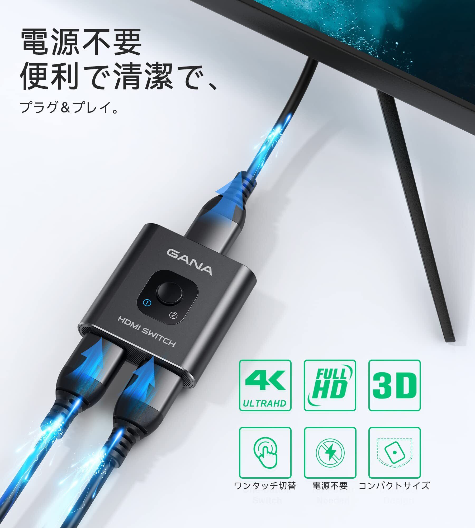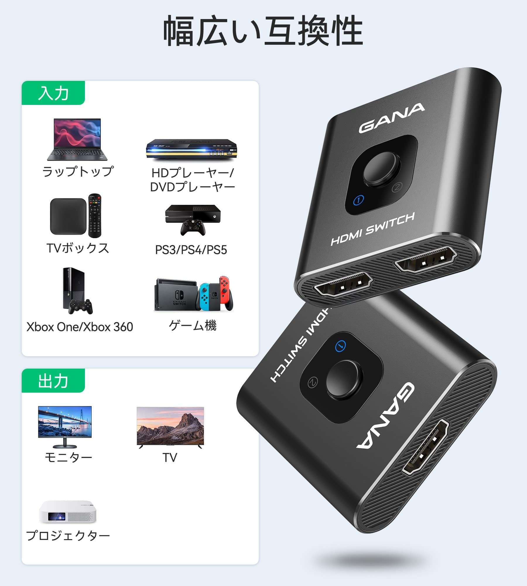HDMI切替器 4k@60hz HDMI分配器、GANA 双方向 hdmiセレクター アルミニウム 1入力2出力/2入力1出力 手動 HDMI 切り替え器 コンパクト Xbox PS5/4/3 DVDプレーヤーFire Stick適用