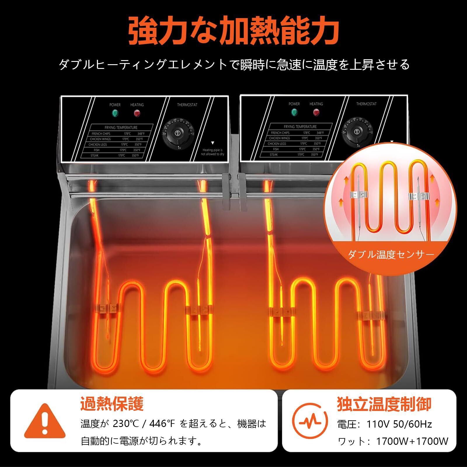 【急速な加熱】遅いヒートアップに飽きた方々へ。この業務用電気フライヤーはデュアルヒーティングエレメントを搭載しており、油温を望む温度に迅速に上げることができます。すぐに調理が始まります。