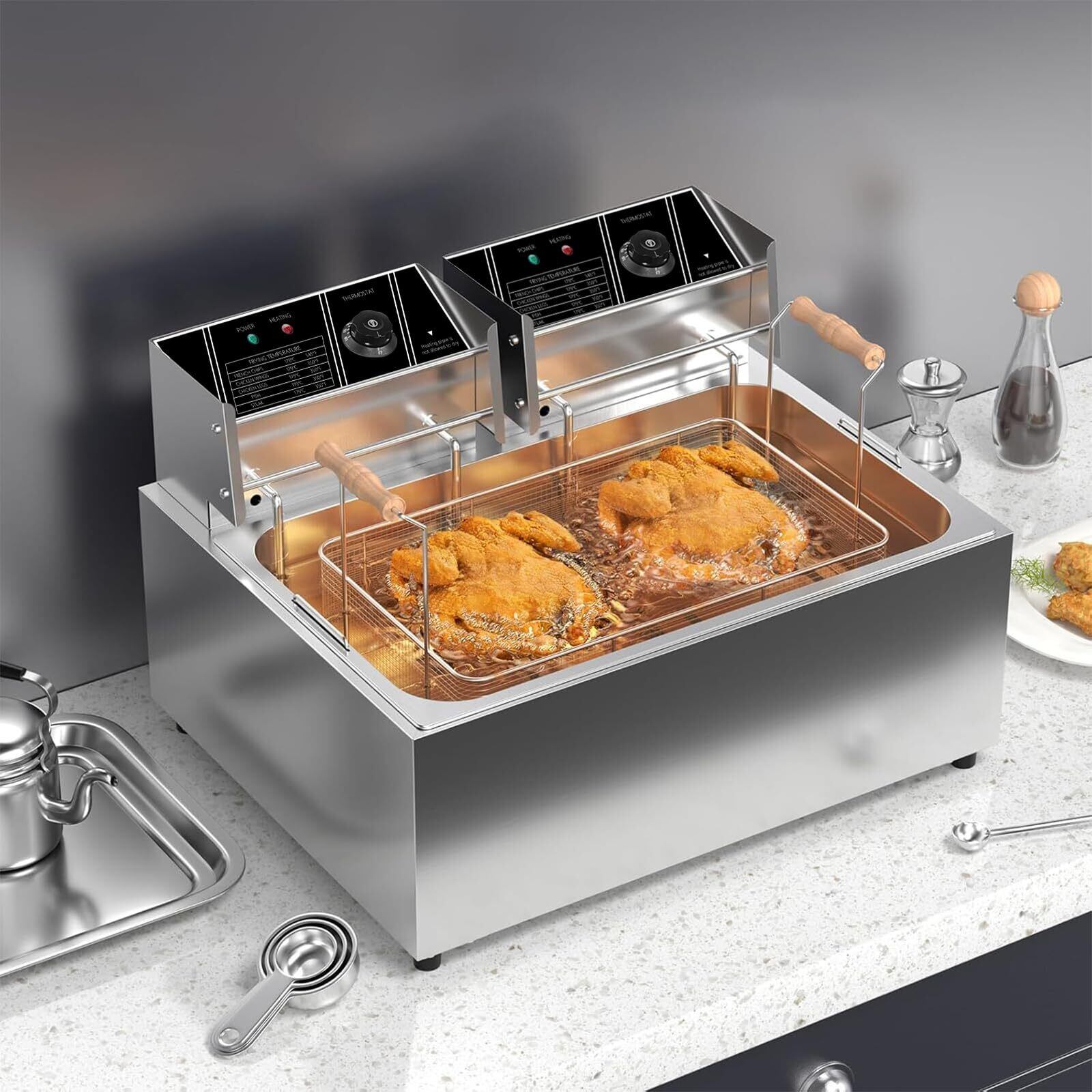 【精密な温度制御】独立したサーモスタット制御のおかげで、60~200°C(140°~392°F)の温度を簡単に調整できます。いつでもすぐに加熱できます。油温が230℃(446℉)を超えた場合や温度コントローラーが故障した際には、フライヤーは自動的にシャットダウンします。