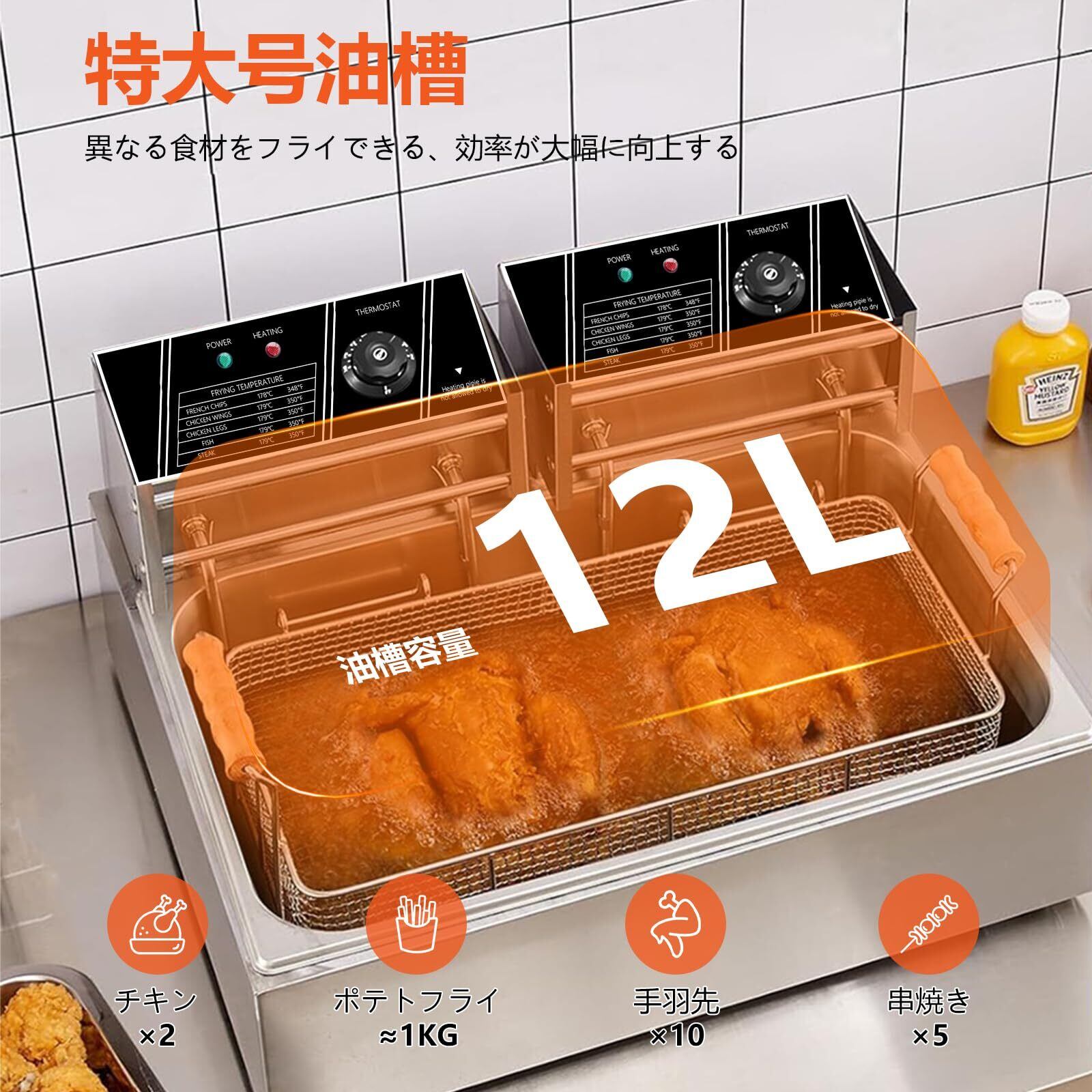 【大容量設計】約12L(12.7Qt)のオイルタンクを装備し、この業務用電気ディープフライヤーでは、大きめの食材、例えば2匹の整鶏を一度にフライすることができます。また、2つの取り外し可能なバスケットを備えており、異なる食材を個別にフライして、それぞれ独特の風味を保持することができます。デリカテッセン、フードスタンド、スナックバー、パーティーなどへの利用に適しています。
