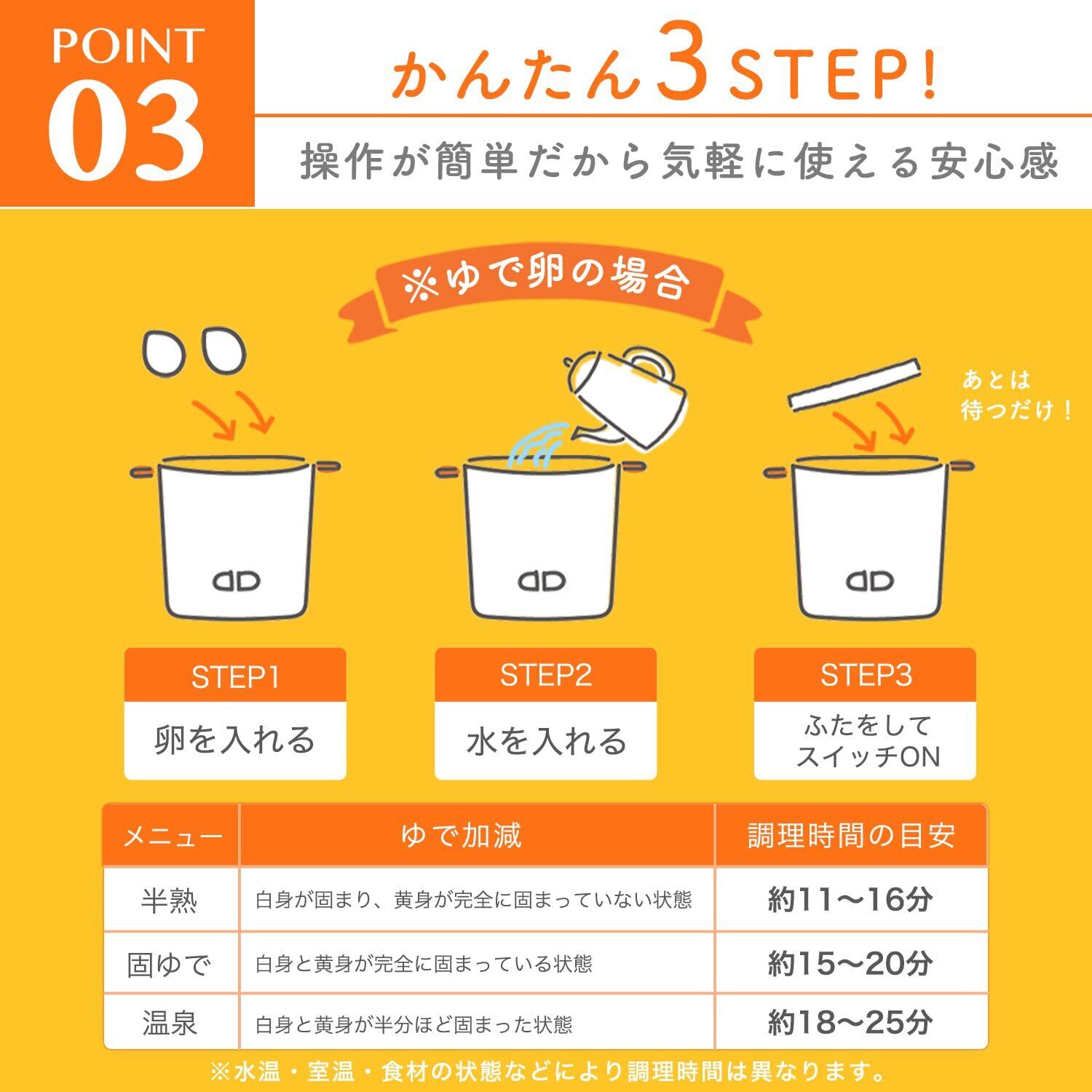 使い方はとっても簡単!本体に卵を入れ、更にそこに水を入れ、ふたをしてスイッチをONするだけ!操作がカンタンだからどなたでも気軽に使える安心感を感じていただけるでしょう。調理時間の目安:半熟/約11~16分、固ゆで/約15~20分、温泉/約18~25分