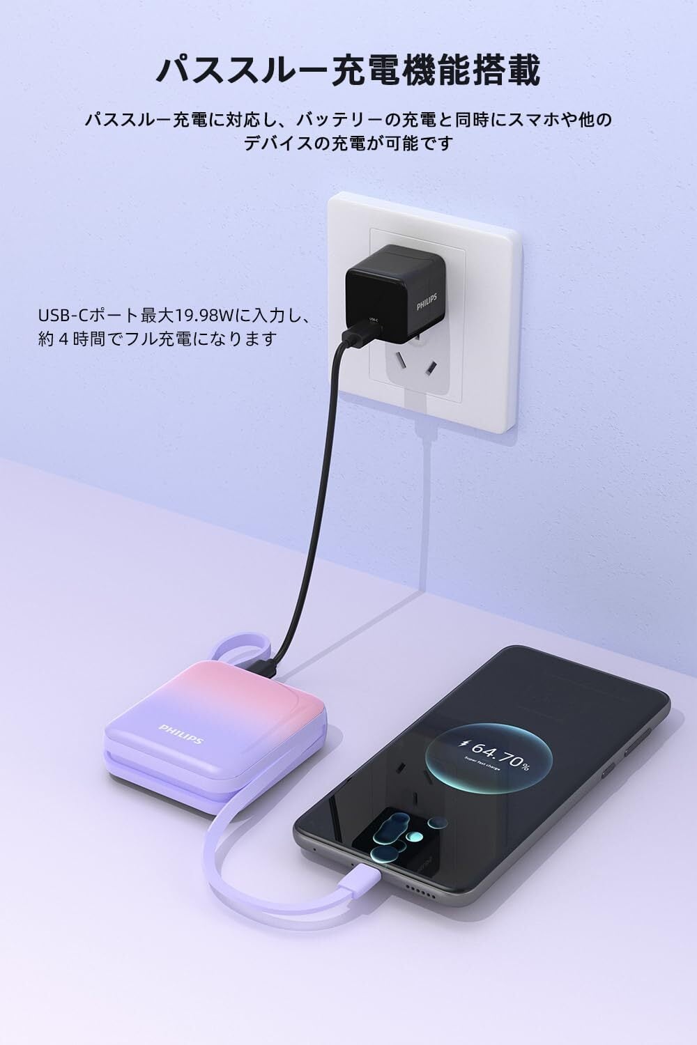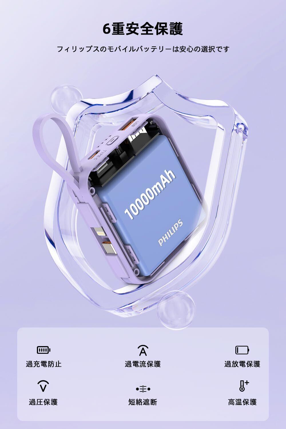 Philips (フィリップス) モバイルバッテリー 10000mAh 大容量 小型 携帯充電器 Lightning type-c ケーブル内蔵 PD 22.5W 急速充電 4台同時充電 スマホ 持ち運び iPhone 16 / 15 Android iPad 各種機器対応 PSE認証済 (ピンク紫)