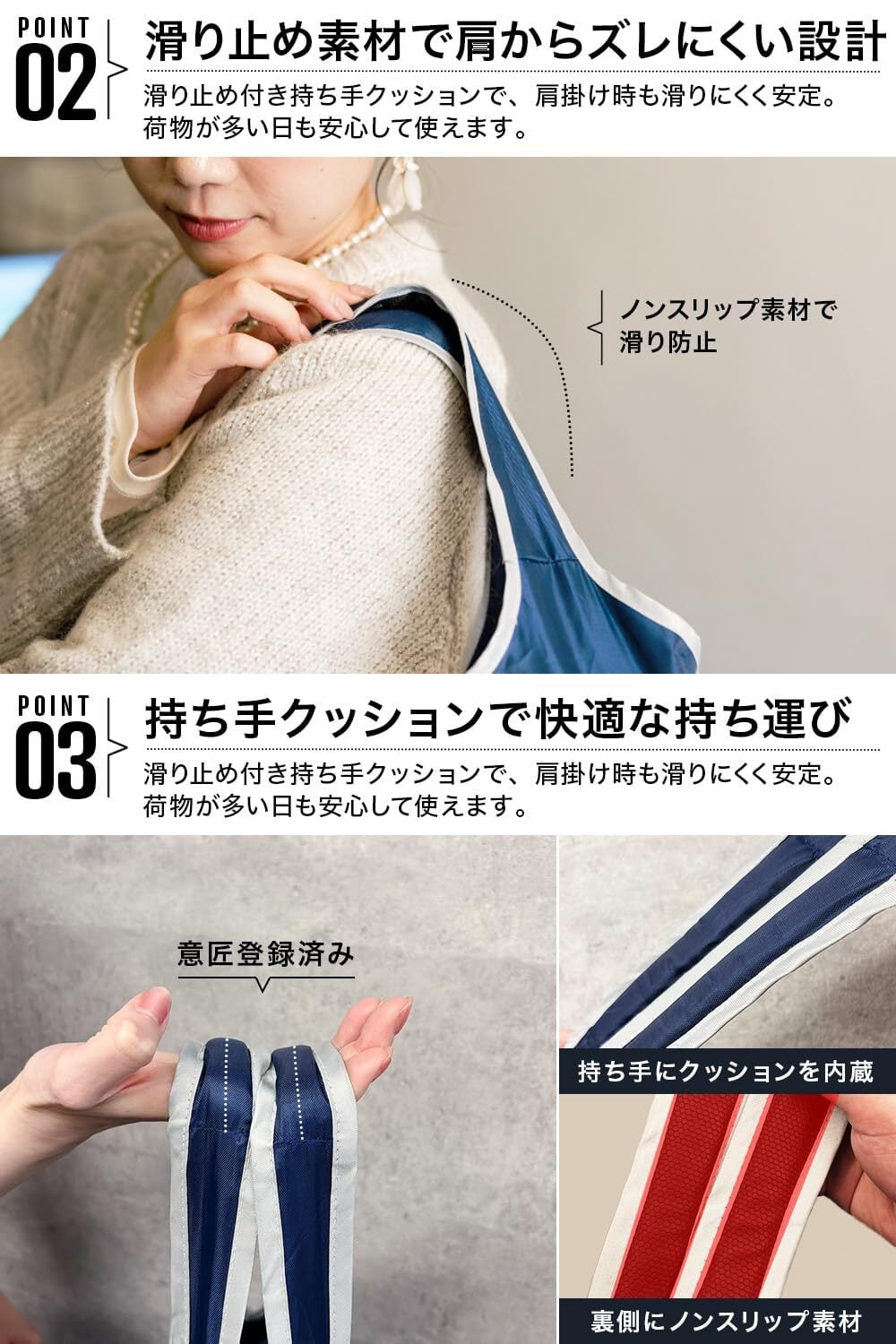 【機能】 折りたたみ可能、コンパクト収納、保冷、保温、撥水、大きいサイズ、大容量、ショルダー 肩掛けOK、作りが丈夫で長持ち、ファスナー付きで中身を守る、マチ付きでお弁当を入れても偏らない、持ち手クッション付きで重い荷物でも手が痛くなりにくい、肩から滑り落ちにくい