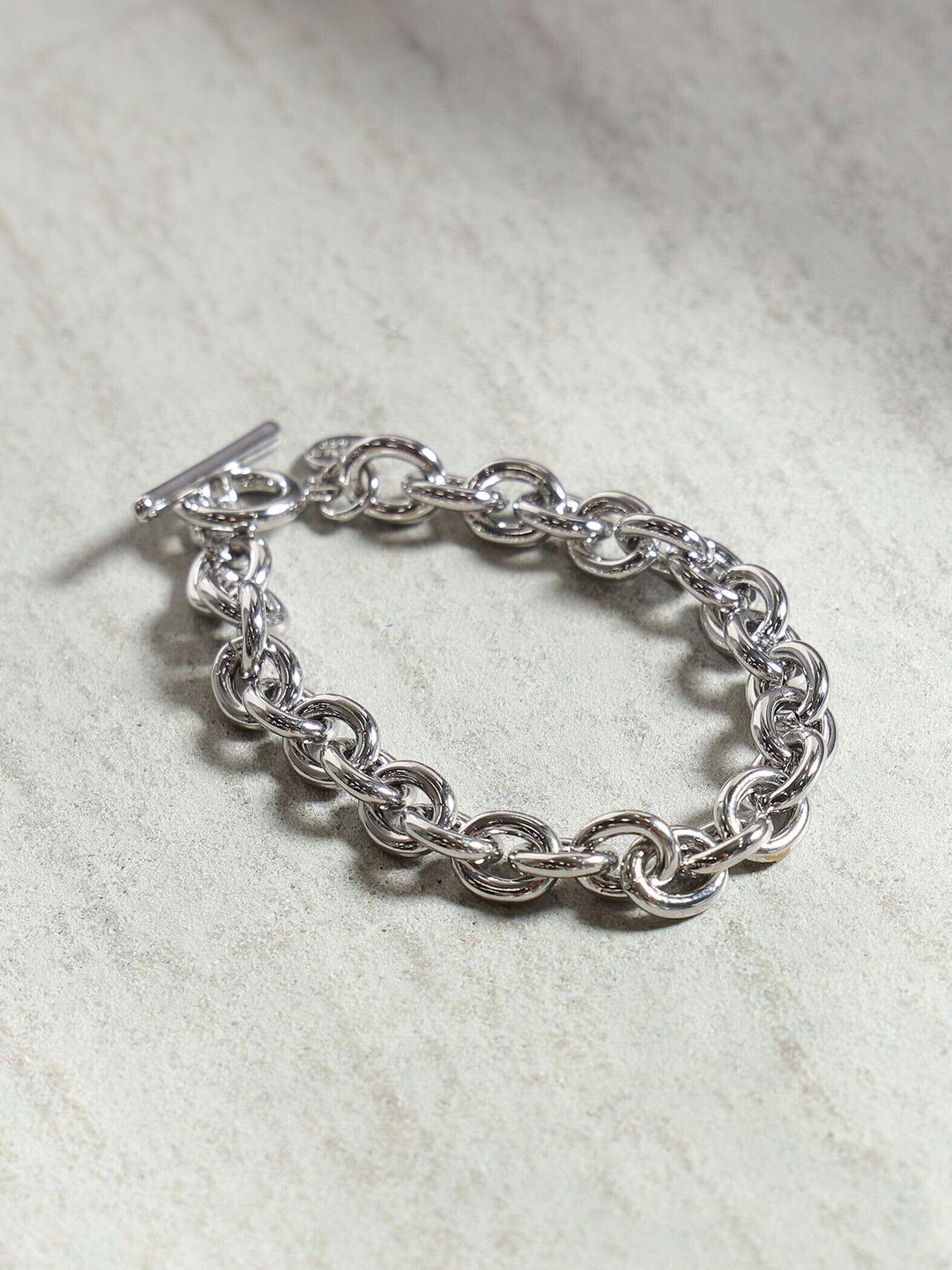 旬のチェーンデザインで仕上げた、存在感のあるブレスレットが登場。敢えて少し長めに仕上げており、こなれ感を演出しました。