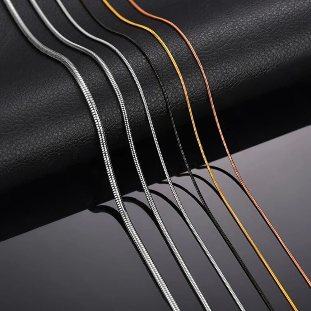 普段使いに最適なシンプルスネークチェーンネックレス!メンズにもレディースにも人気の高いデザインでどなたにでもおすすめできるシンプルなチェーンネックレス!そのままでもお持ちのネックレストップを合わせてもしっかりデザイン性のあるチェーンです。フォーマルスタイルにもカジュアルスタイルにも相性がよく、シーンを選ばずどんな時でも着用OK! カラーバリエーションはゴールドとシルバーの2色展開で太さは2mm、長さも各種取り揃えてあり、自分の好みにあったサイズを選択可能。サイズ違いのチェーンを重ねづけすることで、きれいな輝きで存在感を強調しオシャレにコーディネートすることができます。他のデザインと違い、絡まる事がないので安心!