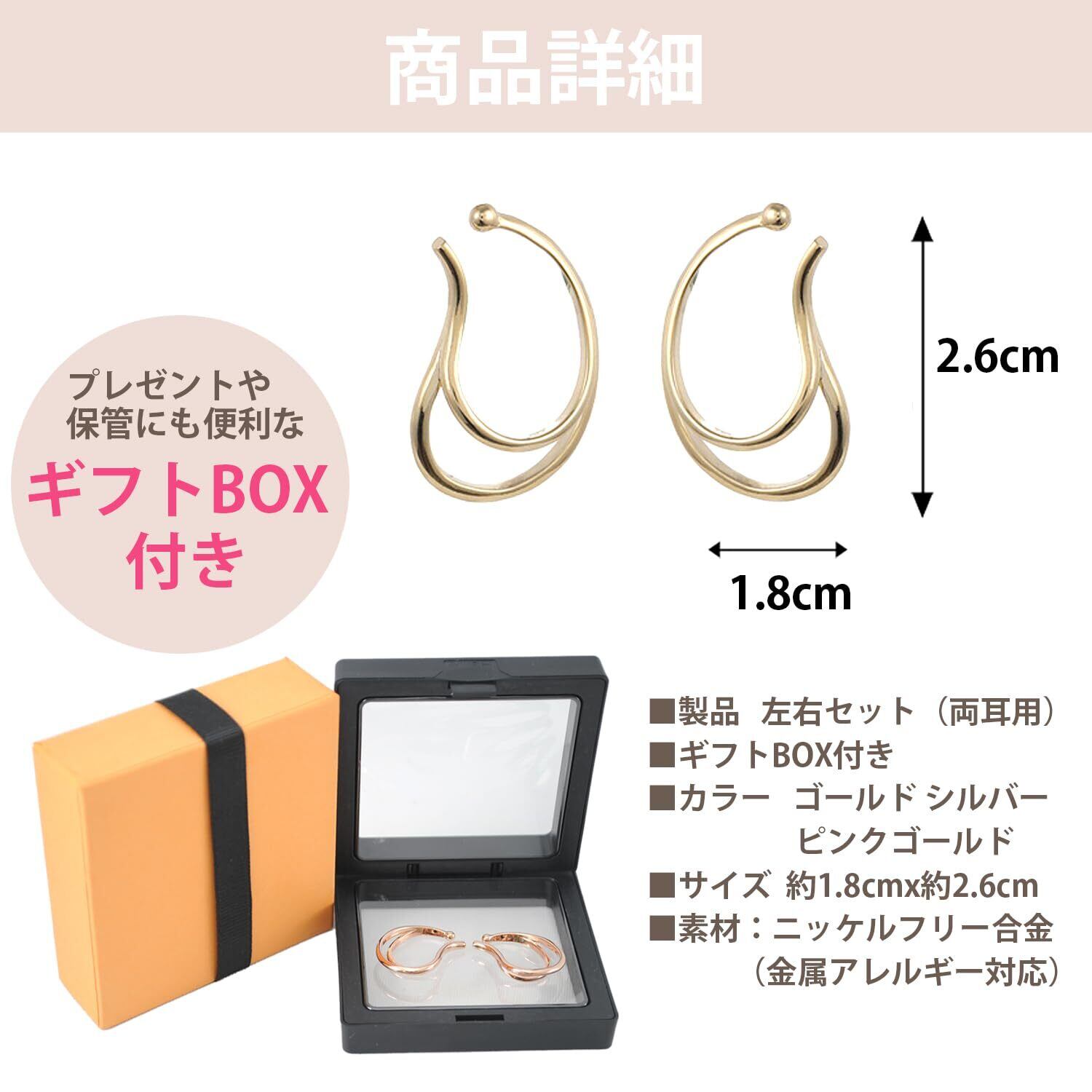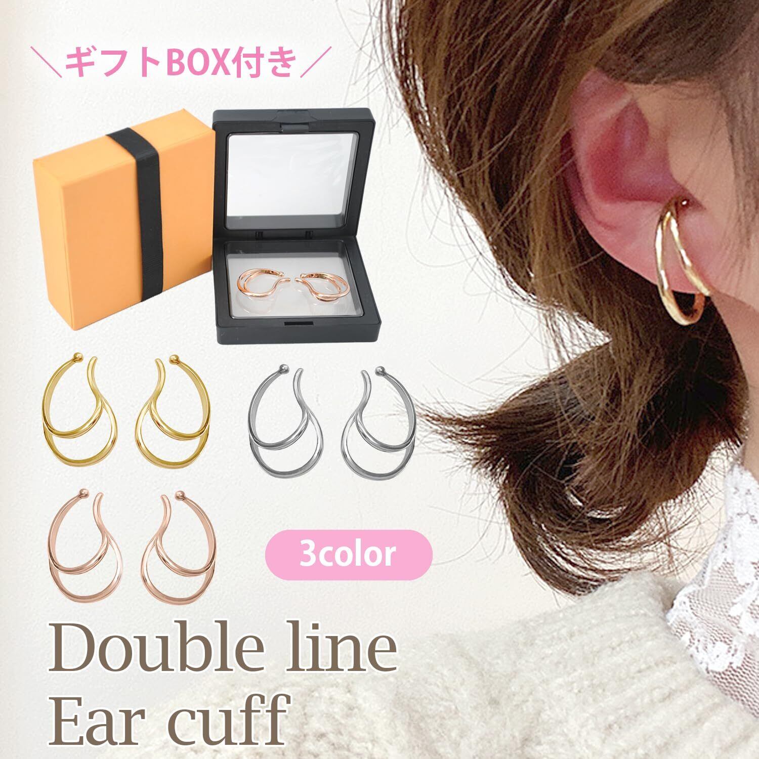 イヤーカフ イヤーカフス 金属アレルギー 対応 左右セット イヤリング 重ね付け ニュアンス ダブルライン ゴールド シルバー ピンクゴールド イヤークリップ ギフトボックス付き まるで重ね付けをしているような、おしゃれなダブルラインが目を引くイヤーカフ。 ニュアンス感のある滑らかなカーブラインがスタイリッシュでおしゃれな、トレンドライクなアイテムです。 ピアスホールが開いてなくても使えるので、自分に合った締め具合でその日の髪型や コーディネートに合わせて好きな位置に付けることができます。 まるでつけているのを忘れるくらいストレスフリーな着用感。しっかり挟めて、痛くなりにくく 長時間使用も楽ちん左右セットなので、両耳につけても、片方使いも、お友達や恋人と片方ずつ付けるのもおすすめです シンプルなので様々なコーディネートに合わせやすく、どんなお顔の形にも合うデザイン。 金属アレルギー対応で肌に優しいのも嬉しいポイント。※アレルギー反応に関しましては個人差がございますので、全ての方に全ての方に適合するものではございません。 ピアスとは違いキャッチなどパーツの紛失の心配がないのも◎カラーは大人っぽいゴールド、ちょっぴりクールなシルバー、 大人可愛いピンクゴールドの3カラーからお選びいただけます。プレゼントにもピッタリで、保管にも飾っても可愛いギフトBOX付きです。